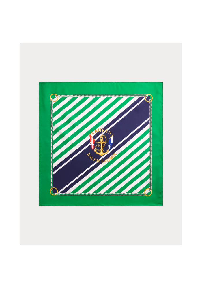 Built of silk, this quadrangle has marine-inspired patterns - such as a badge with anchor and a flag and an outline with a pattern of strings - in a colorful red stripe. 53,5 x 53,5:24 Printed in printed ink.