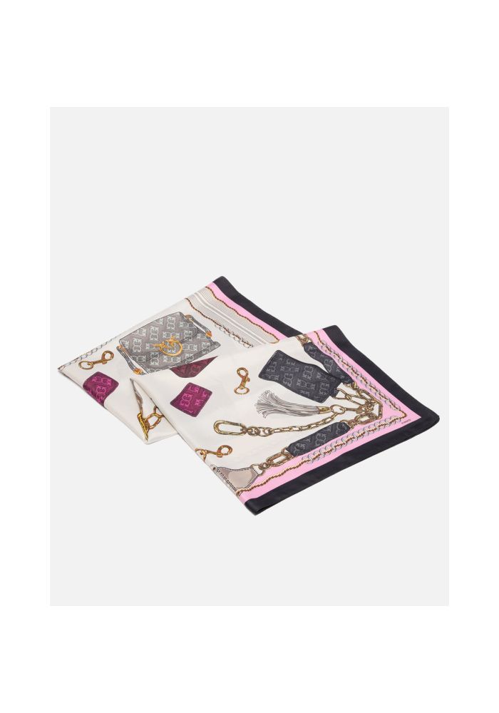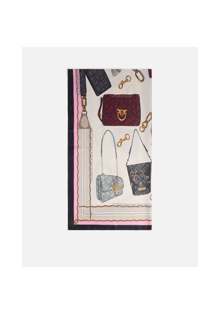 Φουλάρι από απαλό σύμμεικτο μεταξωτό σερζέ ύφασμα. Είναι διακοσμημένο με ένα μοτίβο που απεικονίζει διάφορες τσάντες PINKO σε όλη την επιφάνεια, παραπέμποντας στον κομψό κόσμο των δερμάτινων ειδών, και ολοκληρώνεται με περίγραμμα διαφορετικού χρώματος και με το λογότυπο PINKO στη γωνία. Ένα πρωτότυπο και θηλυκό αξεσουάρ, ιδανικό για να ολοκληρώνει τα σύνολά σας με το αυθεντικό στυλ της PINKO. ΒΙΣΚΟΖΗ 65% ΜΕΤΑΞΙ 35%
