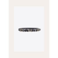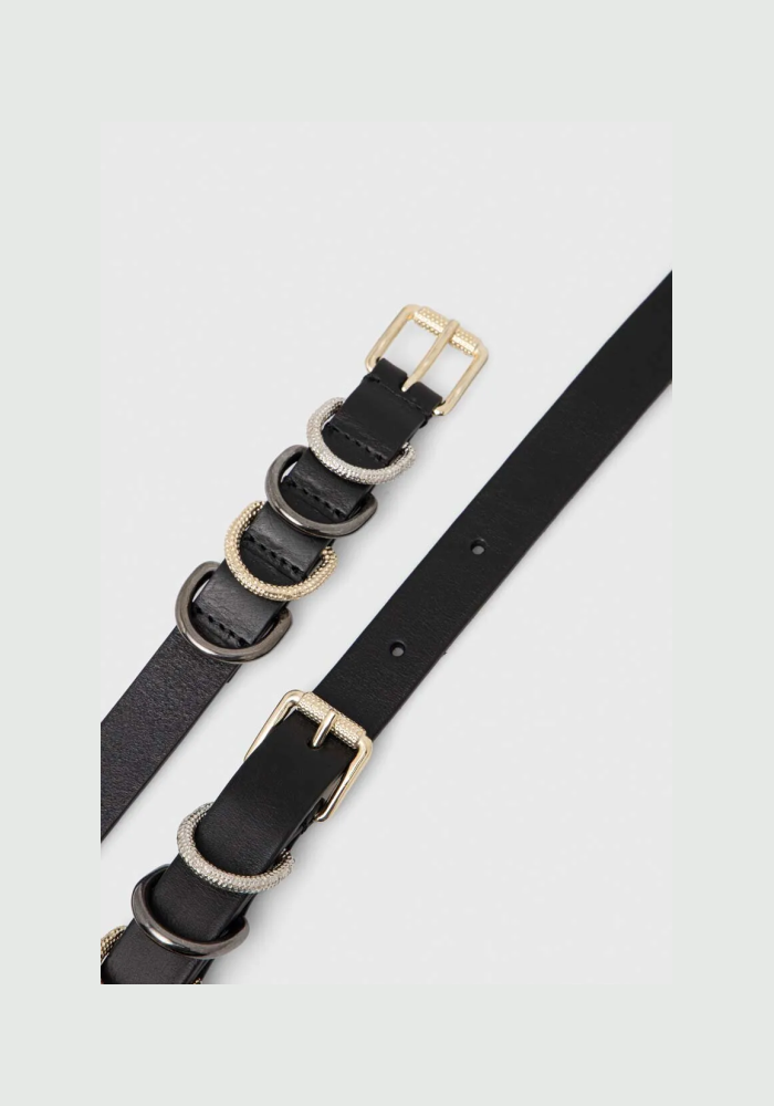 Light belt, 2 cm wide of fine skin, with metallic rings nipples, galvanized in many colors, some with a polygonal appearance.