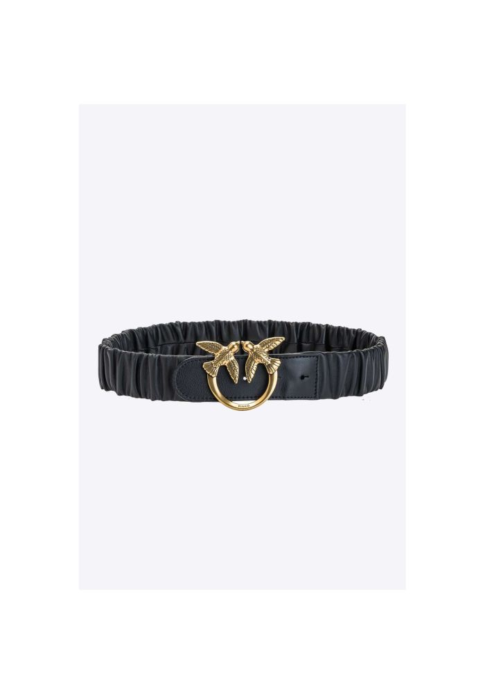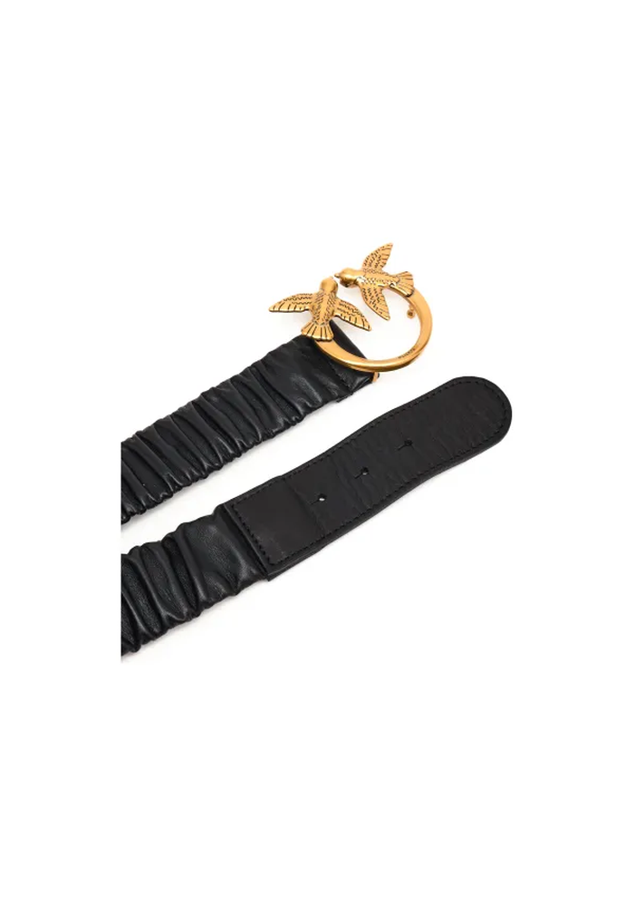 Δερμάτινη ζώνη Nappa με ιδιαίτερο μαζεμένο εφέ και μεταλλική αγκράφα Love Birds Diamond Cut. Nappa leather belt with special gathered effect and Love Birds Diamond Cut metal buckle. Leather: GOATSKIN 100% GOAT 100%