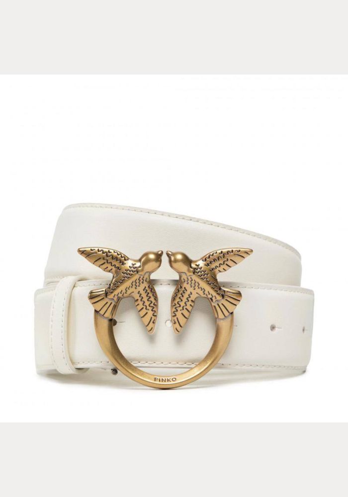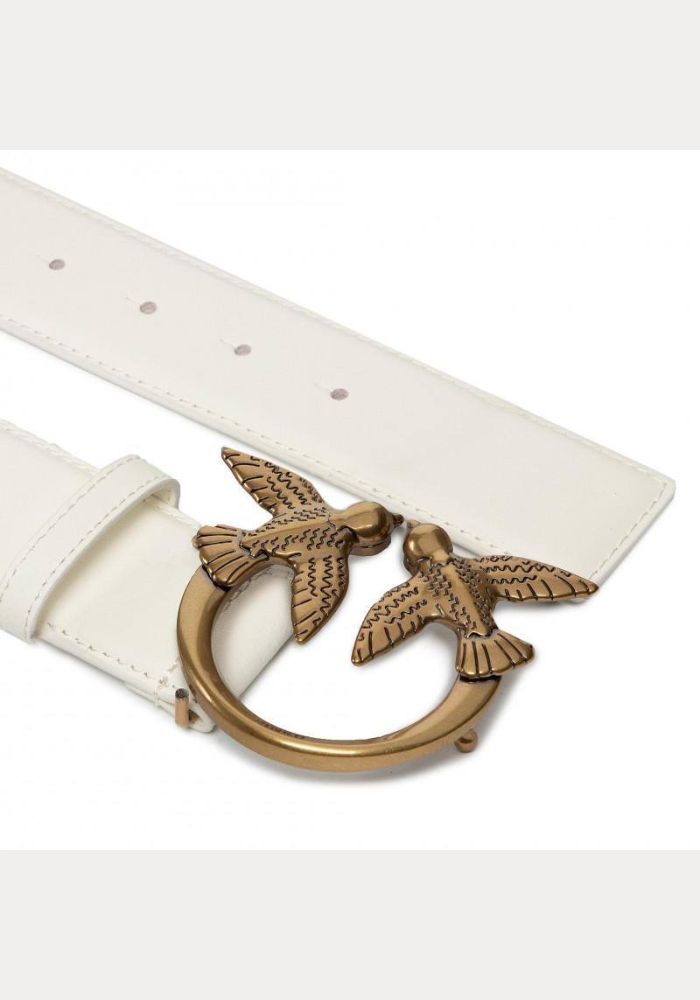 Απαλή, μεταξένια δερμάτινη ζώνη PINKO με αντίκα επιχρυσωμένη μεταλλική αγκράφα Love Birds Diamond Cut. Η ζώνη έχει σχεδιαστεί για να φοριέται στους γοφούς,και μέση. Η ζώνη έχει πλάτος 3 cm. Υλικό: 100% δέρμα.