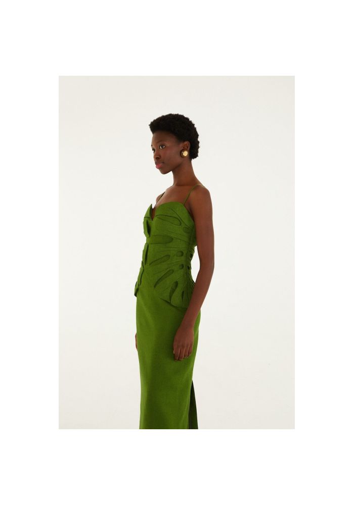 Κατασκευασμένο από λινό υψηλής ποιότητας, αγκαλιάζει μια απαλή σιλουέτα με ένα λεπτό ντεκολτέ σε σχήμα καρδιάς, ενώ οι παιχνιδιάρικες απλικέ από φύλλα monstera καταλήγουν απαλά κατά μήκος του μπούστου. Αυτό το αμάνικο φόρεμα αποπνέει ζεστασιά και φυσική άνεση, προσκαλώντας σας να ενσαρκώσετε τη χαρούμενη άνεση όπου κι αν σας οδηγήσει η μέρα. Ελαφρύ, αναπνεύσιμο και ξεχωριστά σαγηνευτικό, επαναπροσδιορίζει την καλοκαιρινή κομψότητα.