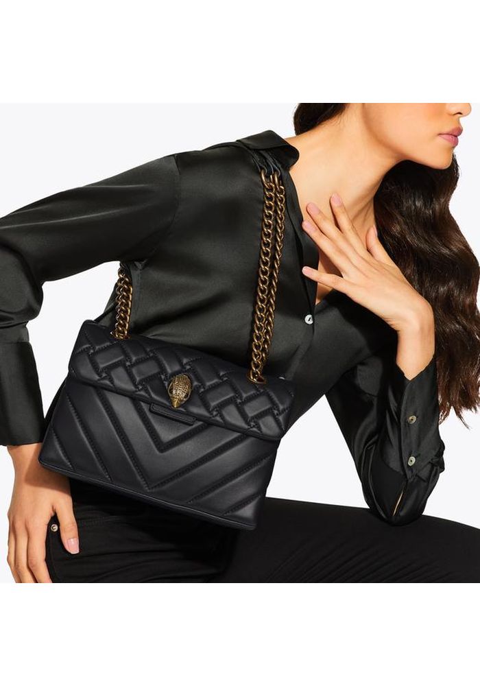 Η δερμάτινη τσάντα Kensington είναι φτιαγμένη από μαλακό δέρμα αρνιού που συνδυάζει μοτίβα ύφανσης και chevron. Η αντικέ ορειχάλκινη κεφαλή Eagle διαθέτει αδιαφανή ορειχάλκινα κρύσταλλα και μαύρα κρυστάλλινα μάτια στο μπροστινό πτερύγιο. Αντίκες ορειχάλκινο λουράκι αλυσίδας με δύο δερμάτινα ένθετα με επένδυση Μαγνητικό κλείσιμο Duo κρυμμένο κάτω από το πτερύγιο Χρυσό φύλλο ανάγλυφο λογότυπο στο πίσω μέρος Μπορεί να χωρέσει τηλέφωνα έως 7 ίντσες Δύο εσωτερικές θήκες με μικρή εσωτερική τσέπη επένδυσης Σύνθεση: Εξωτερικό: Δέρμα αρνιού Εσωτερικό: Μονόγραμμα εσωτερική επένδυση Διαστάσεις: 17 cm (Υ), 26 cm (Μ), 8 cm (Δ) Σταυρό σώμα με λουράκι: 111cm Ιμάντας ώμου: 64cm