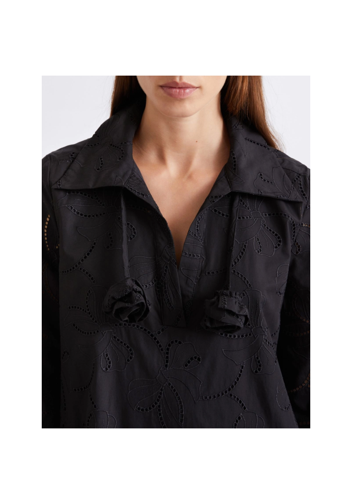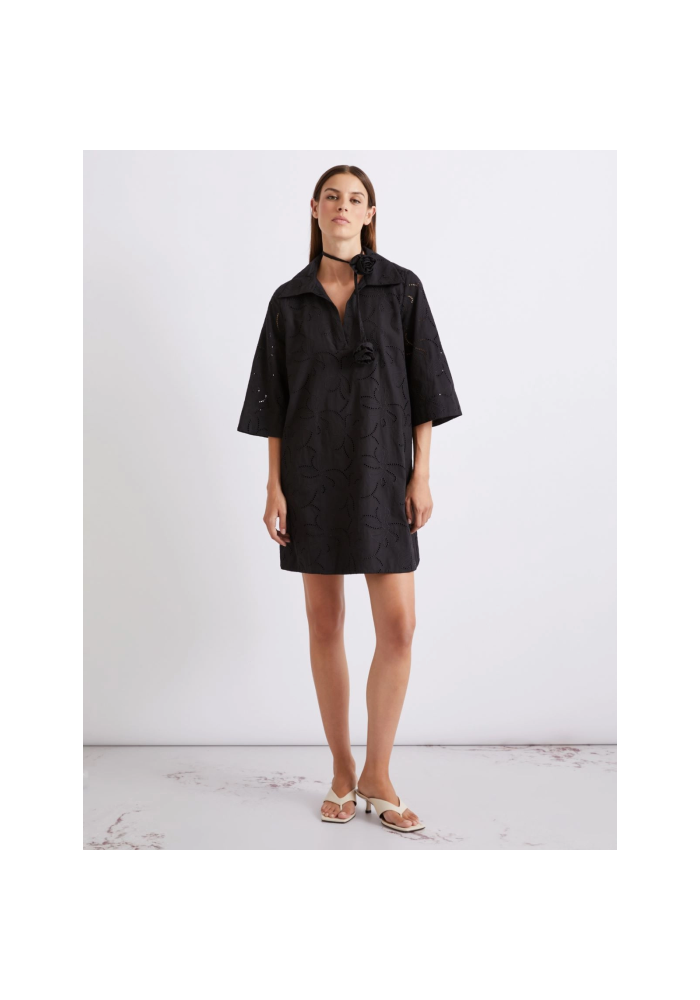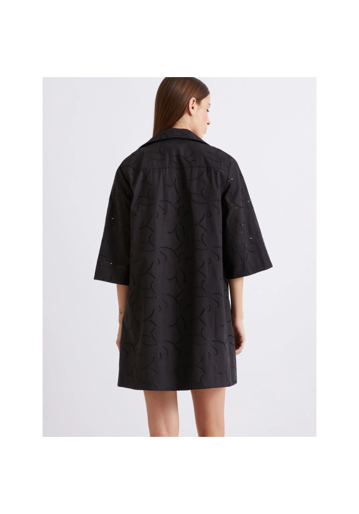 Αντιμετωπίστε τον ζεστό καιρό με αυτό το φόρεμα σε μπροντερί ανγκλέζ. Ο γιακάς του πουκαμίσου, το άνοιγμα σε σχήμα V και τα μανίκια 3/4 συμβάλλουν τολμηρά στον εύκολο, κομψό χαρακτήρα του ενδύματος.