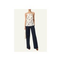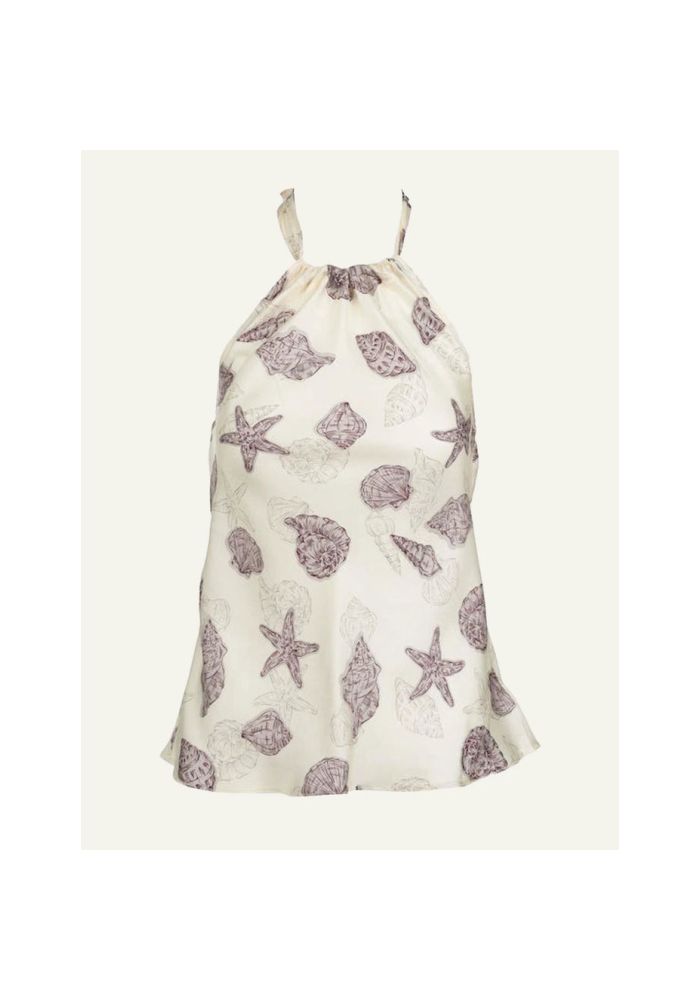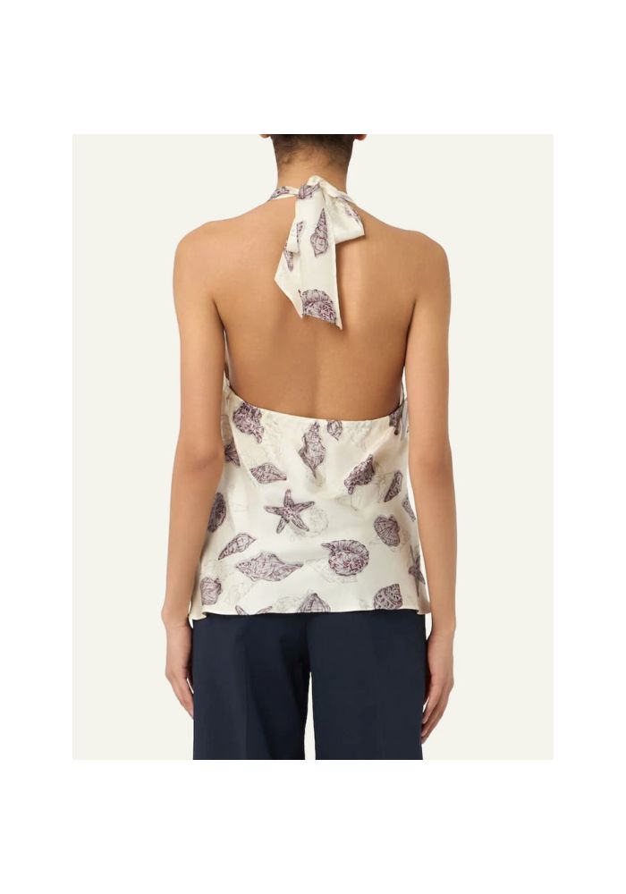 Η κομψότητα του καθαρού μεταξιού, ο αισθησιασμός ενός halterneck: αυτό είναι το τοπ που θα σας συνοδεύσει όλο το καλοκαίρι, με ναυτικό print και χαλαρή εφαρμογή στο μπούστο. Συνδυάστε το με φαρδύ παντελόνι και σανδάλια από τη συλλογή.