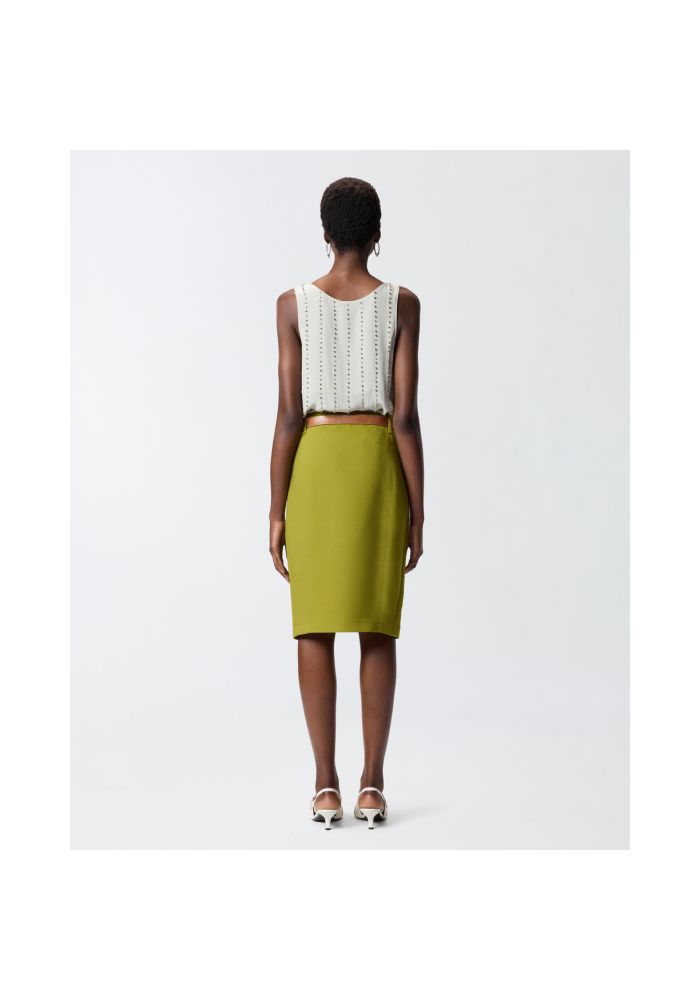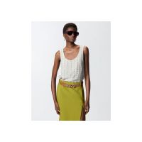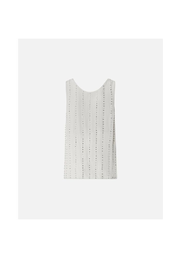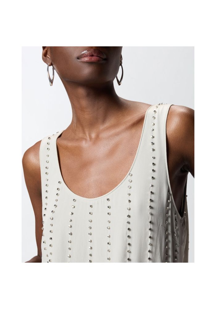 Αμάνικο τοπ σε στυλ φανελάκι με βαθύ στρογγυλό ντεκολτέ, κατασκευασμένο από κρεπ βισκόζη με χυτή, ριχτή υφή. Το ρούχο αποτελεί πραγματικό κόσμημα χάρη στο ιδιαίτερο σχέδιο με ρίγες με έμπνευση από τα ριγέ κοστούμια, που δημιουργείται από την εναλλαγή μικρών μεταλλικών στοιχείων σε σχήμα κύβου και καστονιών με κρύσταλλα, κεντημένα στο χέρι. Με ευκολοφόρετο αλλά κομψό σχεδιασμό, είναι ιδανικό σε συνδυασμό με ένα κλασικό παντελόνι και ένα σακάκι, αλλά και με ένα ιδιαίτερο τζιν.