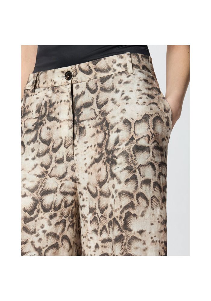 Βερμούδα με ίσια μπατζάκια κατασκευασμένη από καθαρό λινό ύφασμα για δροσιά και απόλυτη άνεση. Διαθέτει θηλύκια για ζώνη και μια τσέπη με φιλέτο πίσω και χαρακτηρίζεται από ένα εντυπωσιακό μοτίβο φιδιού σε όλη την επιφάνεια, που εκφράζει το DNA της PINKO. Ένα δυναμικό και σύγχρονο κομμάτι, που θα κερδίσει με την πρώτη ματιά τις λάτρεις του animal print και όχι μόνο. Εξωτερικό ύφασμα: ΛΙΝΑΡΙ 100% - Φόδρα: ΒΑΜΒΑΚΙ 100% Πλύσιμο και φροντίδα Απαλό πλύσιμο σε μέγιστη θερμοκρασία 30°C - Μην κάνετε λεύκανση με χλώριο - Μην χρησιμοποιείτε στεγνωτήριο - Σιδέρωμα σε μέγιστη θερμοκρασία 110°C - Απαλό στεγνό καθάρισμα με τετραχλωροαιθυλένιο.