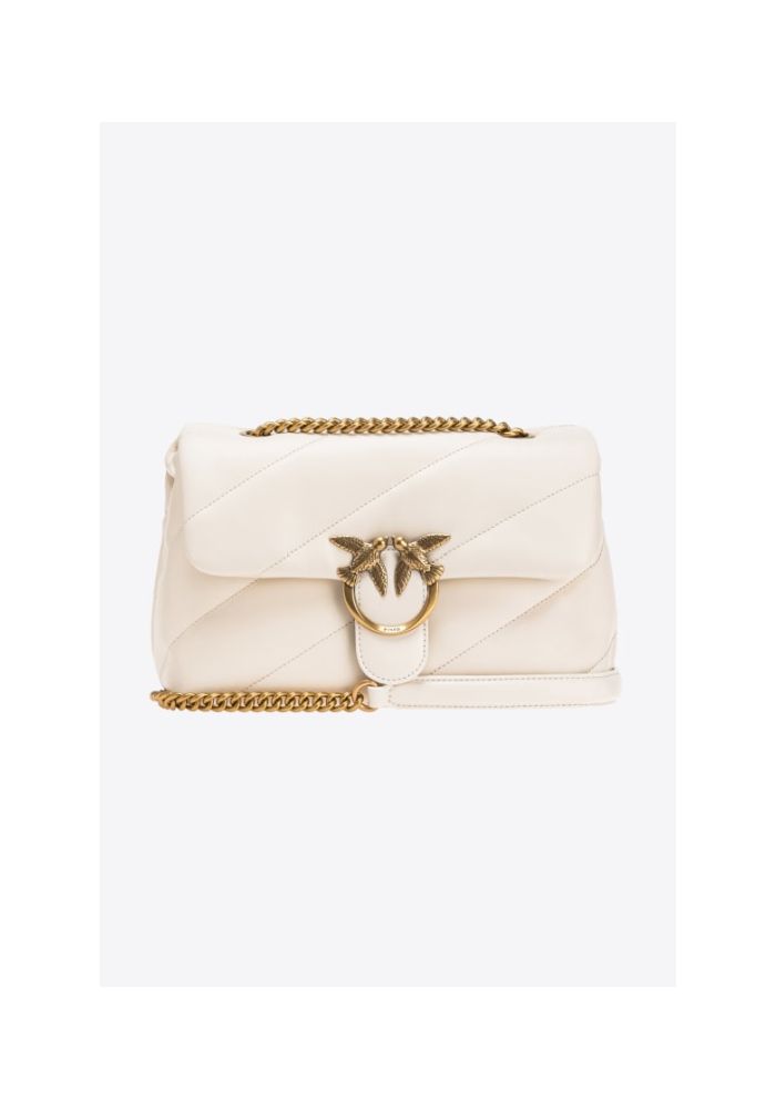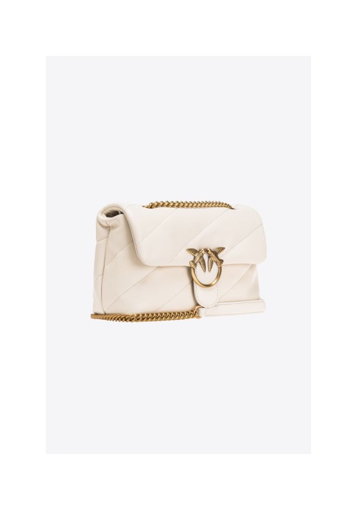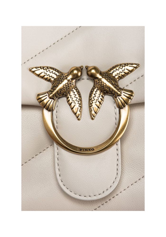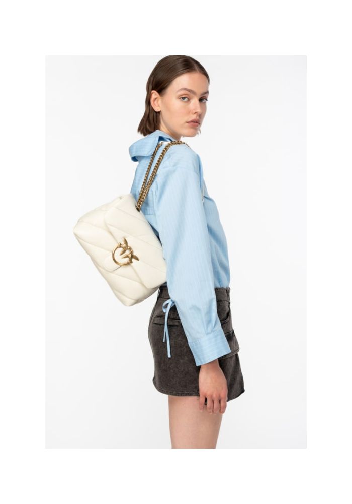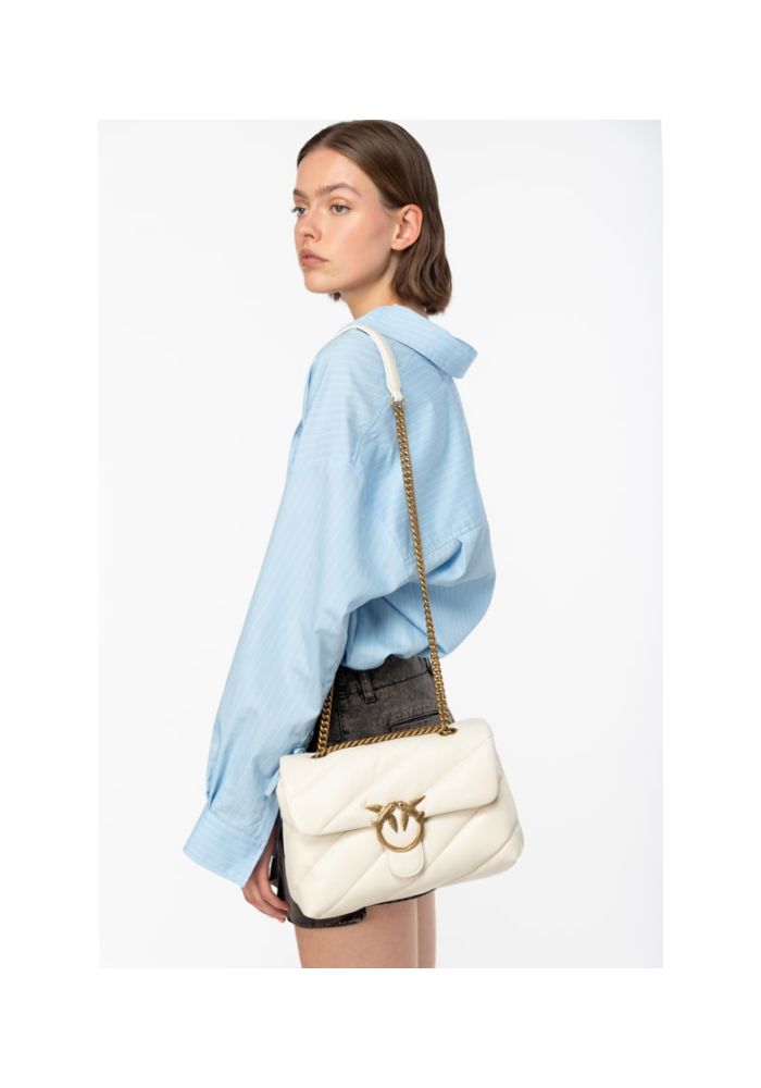 Τσάντα Classic Love Bag Puff από μαλακό δέρμα nappa με maxi, λοξό καπιτονέ σχέδιο. Το κλείσιμο ολοκληρώνεται με την εμβληματική μεταλλική αγκράφα Love Birds Diamond Cut. Το εσωτερικό είναι φοδραρισμένο με ύφασμα από μικροΐνες με σουέτ υφή και διαθέτει διαχωριστικό που κλείνει με φερμουάρ και τσέπη στο τοίχωμα. Το λουρί συνδυάζει την κλασική στρογγυλή μεταλλική αλυσίδα με το πρακτικό λουράκι ώμου από δέρμα nappa. Υλικό: ΔΕΡΜΑ ΠΡΟΒΑΤΟΥ 100% Ύψος: 19 cm Πλάτος: 11 cm Μήκος: 26 cm