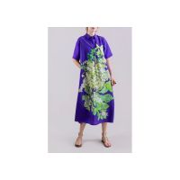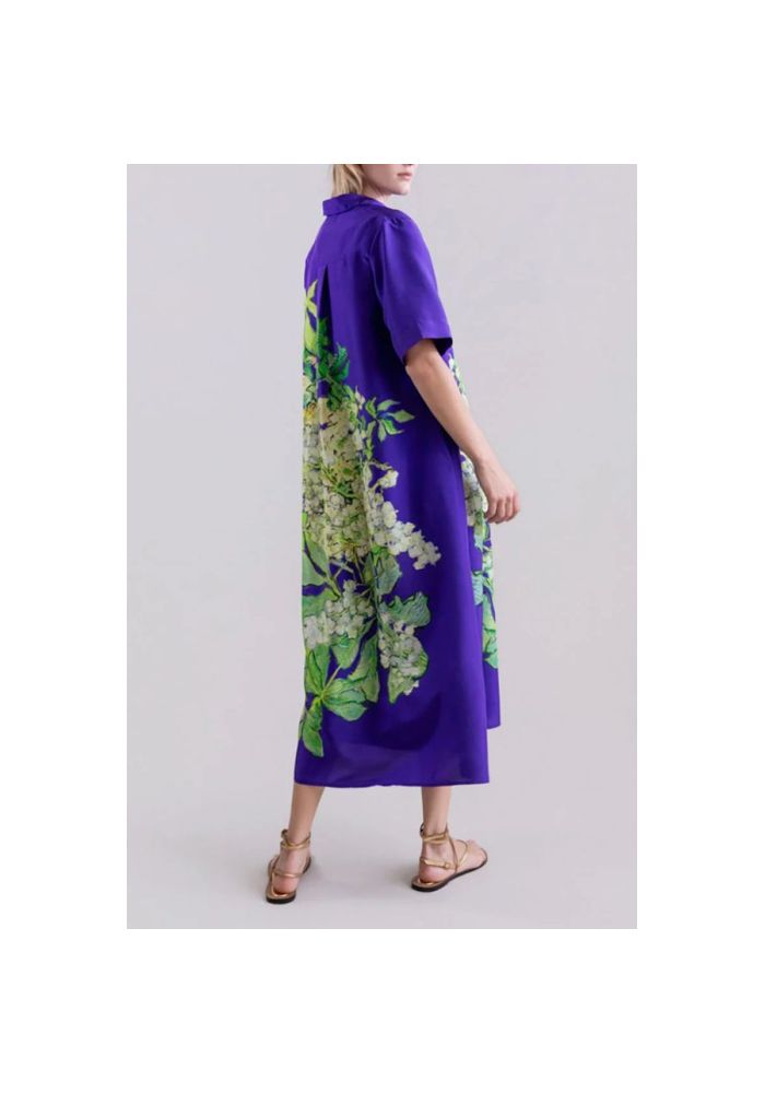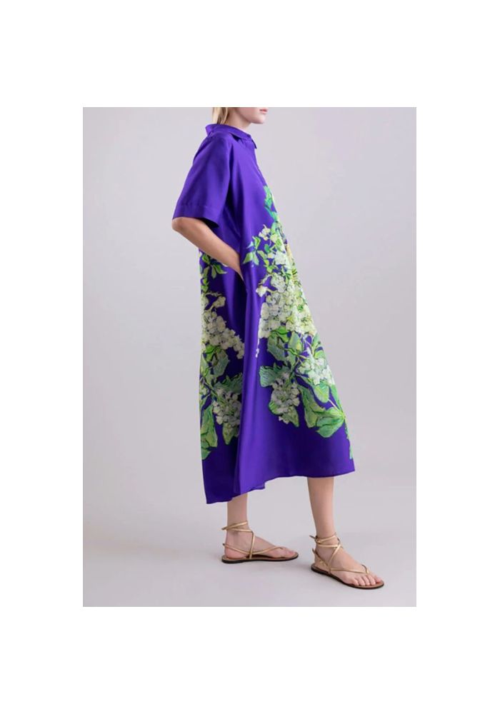 Αυτό το μακρύ φόρεμα, εμπνευσμένο από πουκάμισο, συνδυάζει τη δομή και τη ρευστότητα σε μια γλυπτική σιλουέτα που φτάνει μέχρι τον αστράγαλο. Κατασκευασμένο από μετάξι προσφέρει ανάλαφρη αίσθηση, φρεσκάδα και φυσικό ντραπέ, παρέχοντας άνεση χωρίς να θυσιάζει τον ορισμό. Τα κοντά μανίκια και κλειστός γιακάς του πουκαμίσου παραπέμπουν σε κλασικό ράψιμο, ενώ οι καθαρές, διακριτικά ογκώδεις γραμμές δημιουργούν ένα σύγχρονο και κομψό αποτέλεσμα.Η εκτύπωση Hydrangea Brush, με τα μεγάλα λουλούδια και τα στυλιζαρισμένα φύλλα, που αποδίδονται με χειροποίητες πινελιές, δημιουργεί ένα δυναμικό και περιβάλλον μοτίβο. Οι καθορισμένες λεπτομέρειες και τα αρμονικά χρώματα ενισχύουν την ποιότητα του μεταξιού, προσδίδοντας έναν καλλιτεχνικό και εκλεπτυσμένο χαρακτήρα στο σχέδιο.