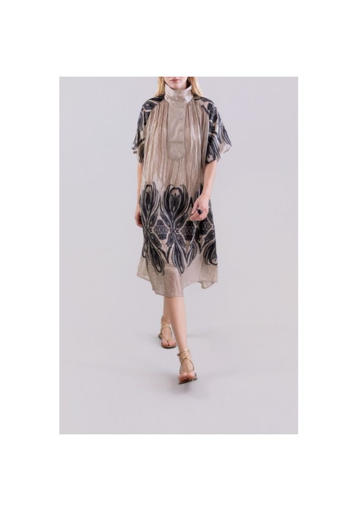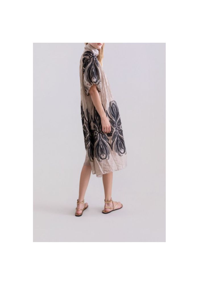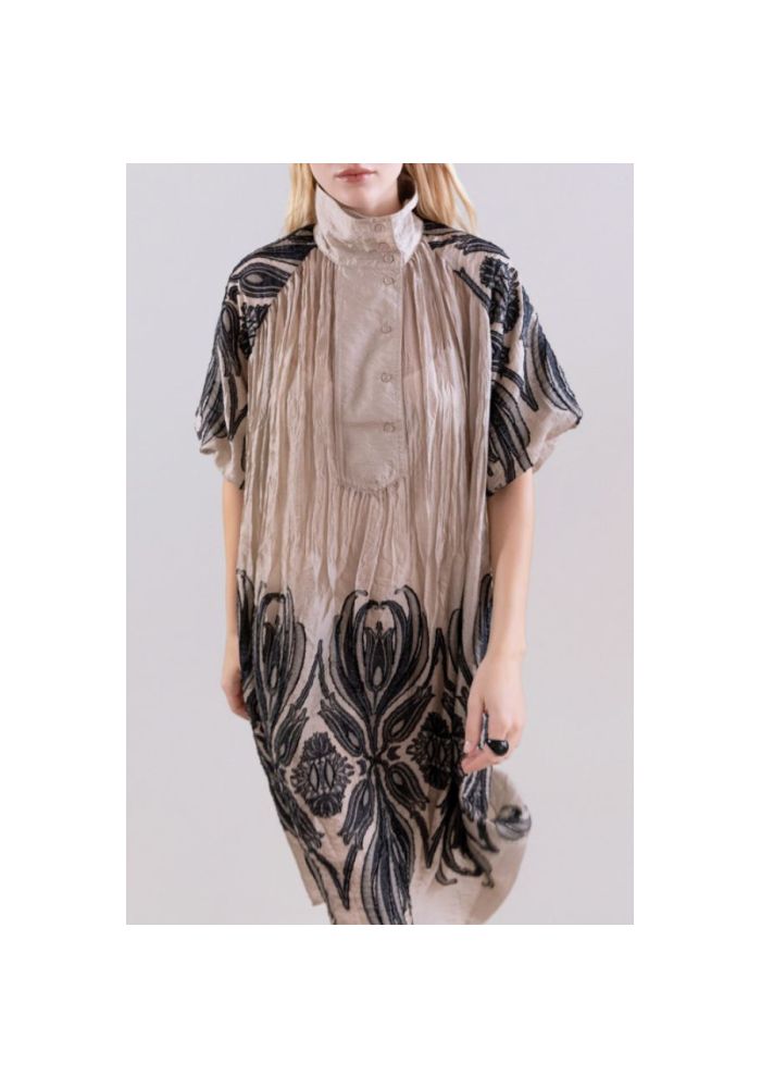 Ένα μίντι φόρεμα με ρέουσα σιλουέτα και ανάλαφρο ντραπέ, σχεδιασμένο για να αναδεικνύει τη φυσική ομορφιά της κίνησης. Κατασκευασμένο από απαλό, λεπτό ύφασμα με υφή, διαθέτει τσαλακωμένο φινίρισμα που προσδίδει χειροποίητο χαρακτήρα και οργανική αίσθηση. Το σχέδιο διαθέτει ψηλό λαιμό με κλείσιμο με κουμπιά μπροστά που ισορροπεί την κομψότητα και την άνεση. Τα κοντά, φαρδιά μανίκια, εμπνευσμένα από κιμονό,προσφέρουν ελευθερία κινήσεων και μια χαλαρή αλλά και εκλεπτυσμένη εμφάνιση. Ξεχωρίζει για τα διακοσμητικά κεντήματα με βοτανική έμπνευση που δημιουργούν αντίθεση στα μανίκια και το στρίφωμα, δημιουργώντας ένα αρμονικό και διαχρονικό οπτικό αποτέλεσμα. Ο ουδέτερος βασικός τόνος ενισχύει την ευελιξία του ενδύματος, καθιστώντας το βασικό κομμάτι για μια σύγχρονη και κομψή γκαρνταρόμπα.Ένα ένδυμα που συνδυάζειτην τέχνη, το design και τη λειτουργικότητα.