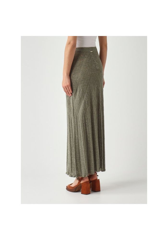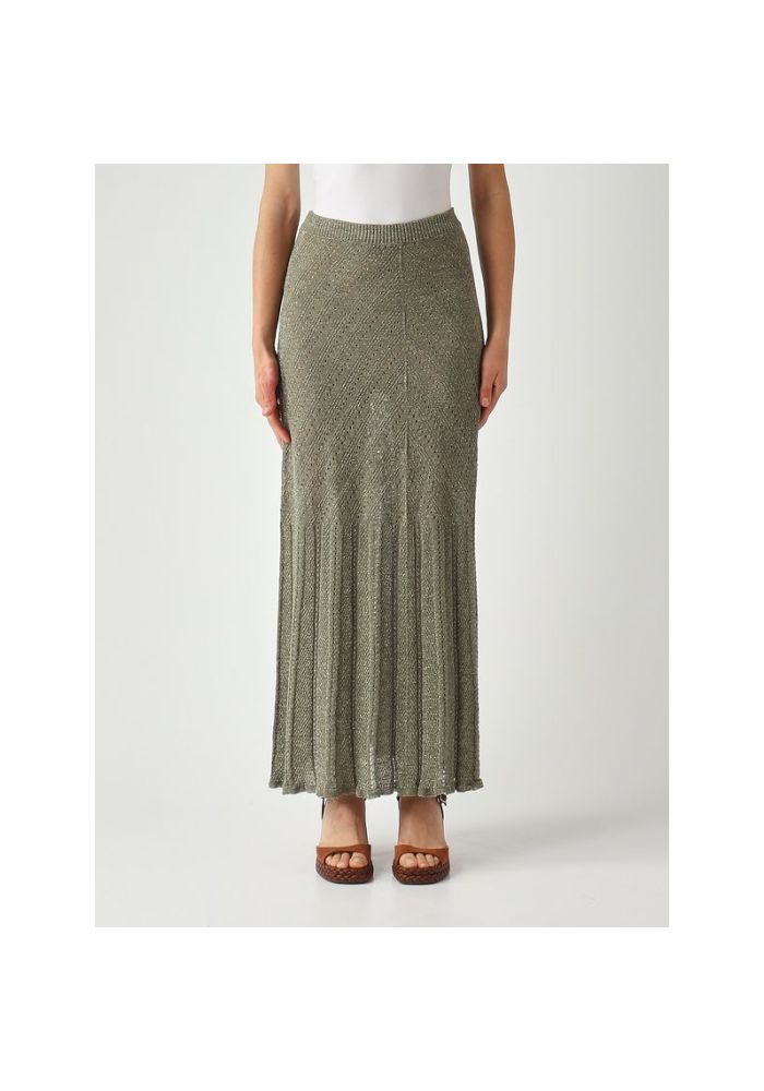 Μακριά φούστα από πλεκτό με lurex, κατασκευασμένη στην Ιταλία, με ανοιχτό μοτίβο σε σχήμα chevron που οριοθετεί τη σιλουέτα. Ελαστική μέση, πλάκα με λογότυπο στην πλάτη και εφαρμοστή σιλουέτα.