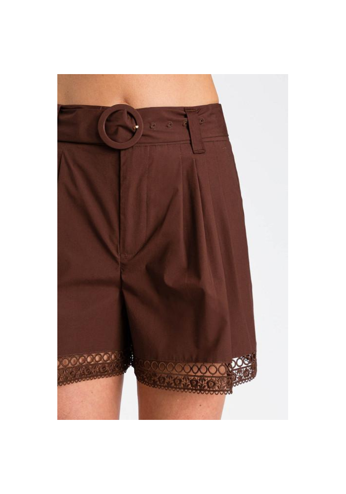 Σόρτς με κεντημένο στρίφωμα. Πιέτες μπροστά, ανδρικό κούμπωμα με γάντζο και φερμουάρ, πλαϊνές τσέπες, ασορτί ζώνη με καλυμμένη αγκράφα, ελαφρώς φαρδιά εφαρμογή.