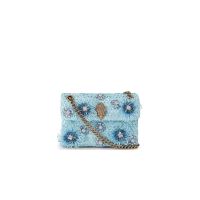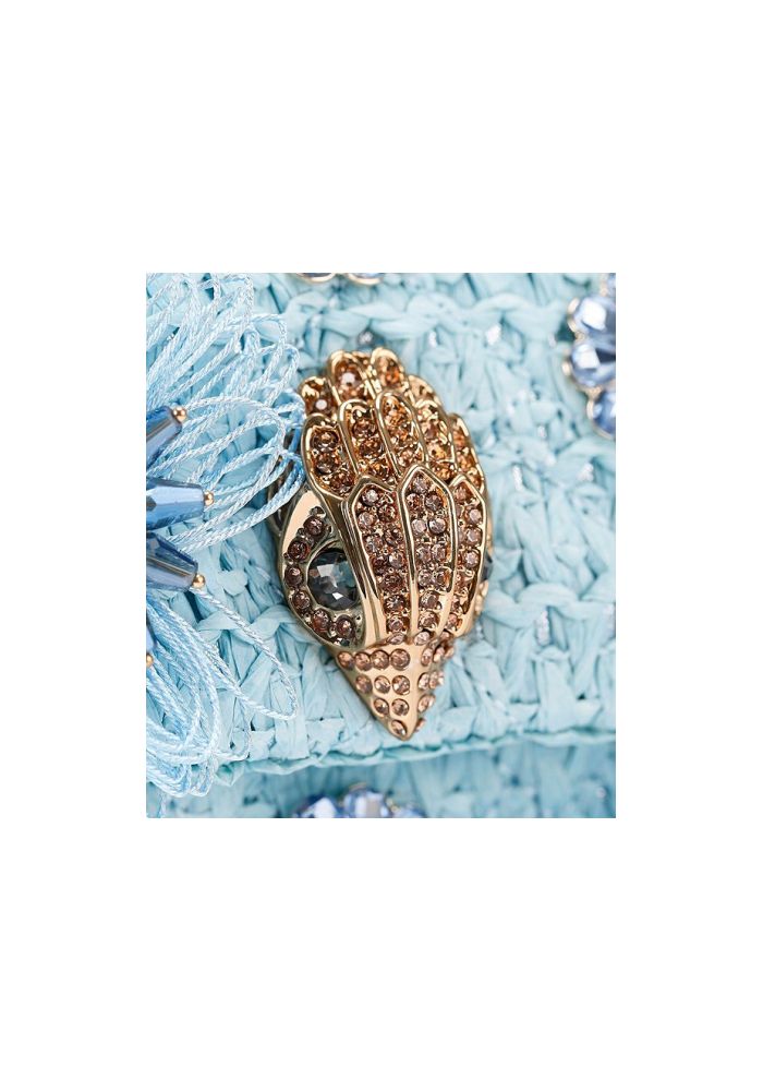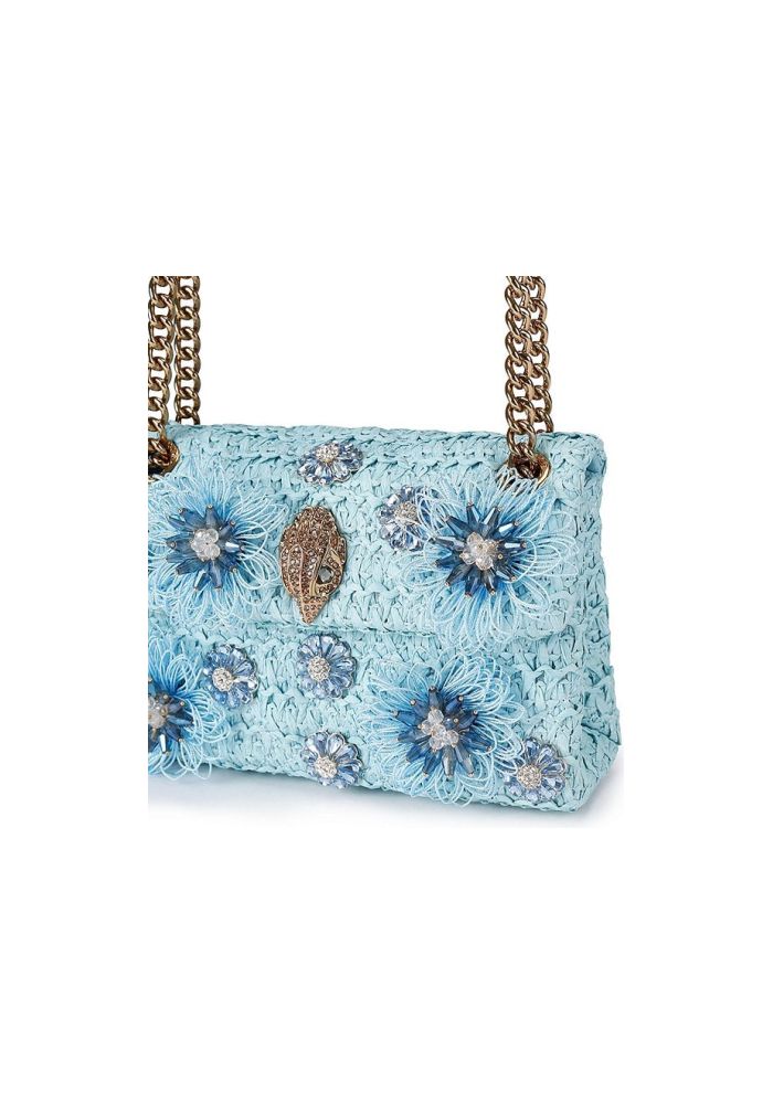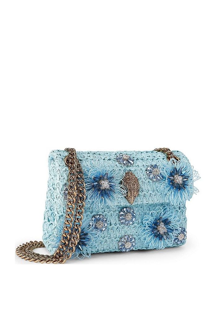 Αυτή η τσάντα Mini Raffia Kensington είναι κατασκευασμένη από ύφασμα light blue raffia με overstitch quilting. Το μπροστινό μέρος είναι διακοσμημένο με σιέλ  λουλούδια με χάντρες. Η χρυσή κεφαλή αετού έχει κρυστάλλους στο μπροστινό καπάκι.