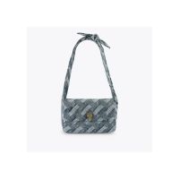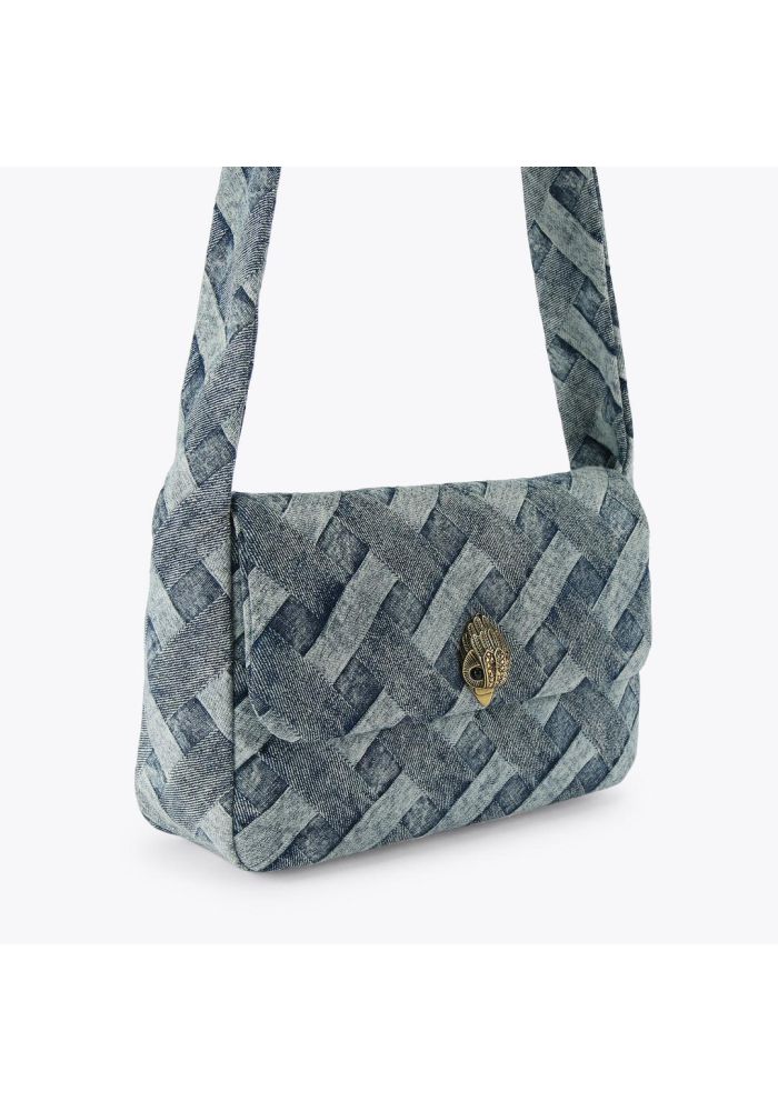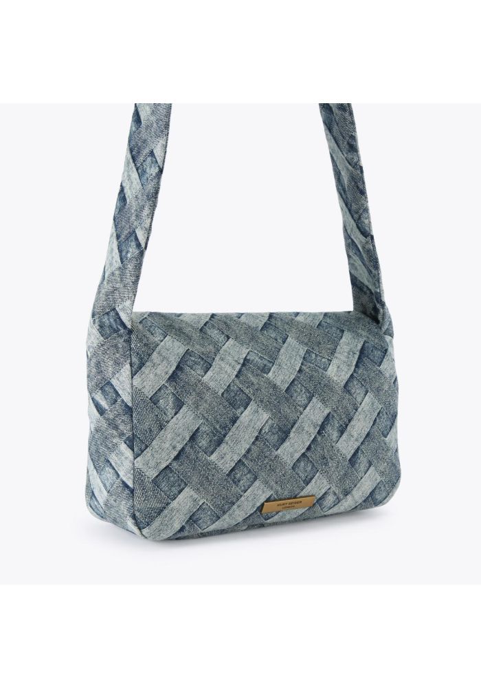Αυτή η τσάντα ώμου Kensington Knot διαθέτει μπλε τζιν εξωτερικό με σχέδιο λευκασμένης ύφανσης.