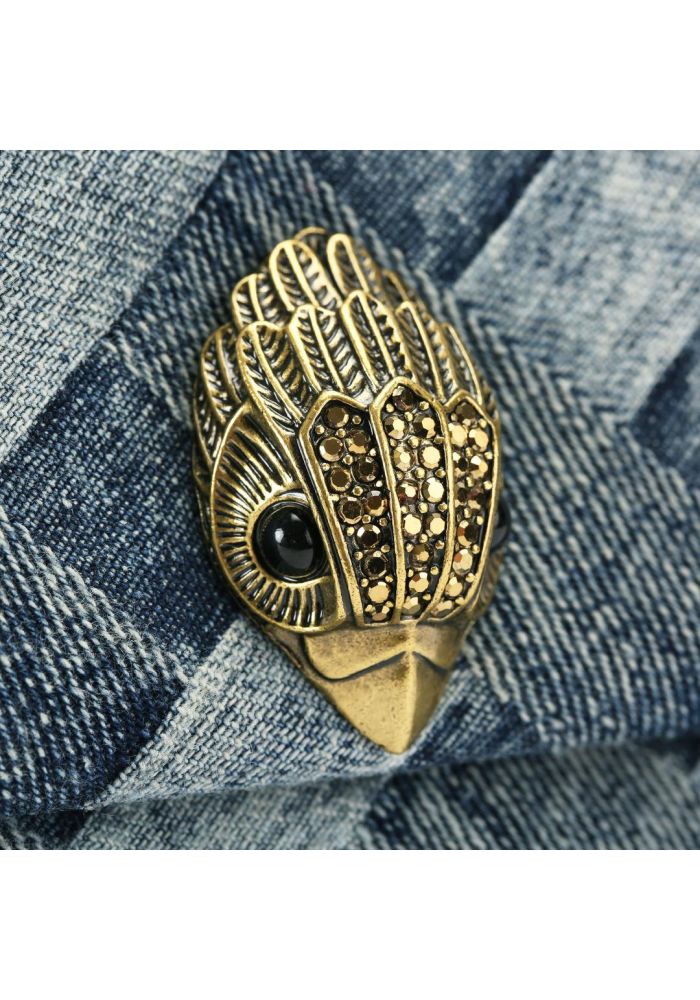 Αυτή η τσάντα ώμου Kensington Knot διαθέτει μπλε τζιν εξωτερικό με σχέδιο λευκασμένης ύφανσης. Υπάρχει ένα απλό λουράκι ώμου με λεπτομέρεια με κόμπους και αντίκα ορειχάλκινη κεφαλή αετού στο μπροστινό καπάκι.