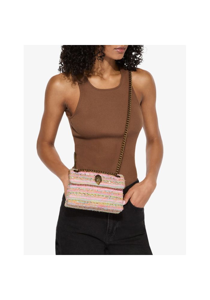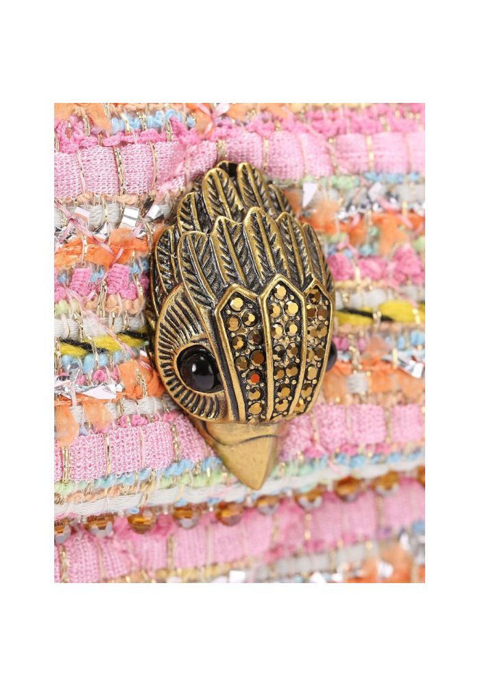 Η τσάντα Mini kensington διαθέτει ροζ τουίντ εξωτερικό, διακοσμημένο με κρύσταλλα. Υπάρχει μια αντικέ χρυσή κεφαλή αετού στο μπροστινό καπάκι.