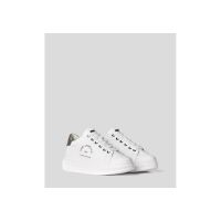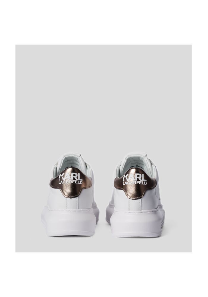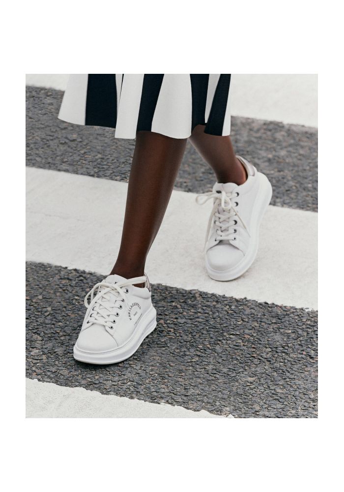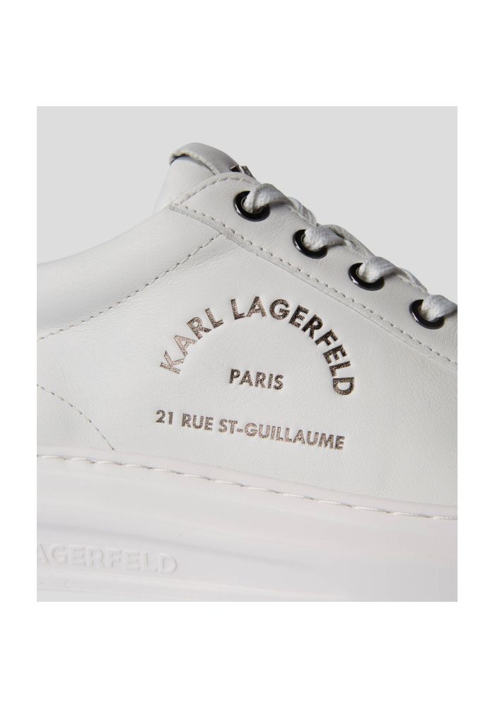 The metallic glass on the emblematic Maison KARL logo is reflected on the thigh, framing a minimalist Nappa leather sneaker.