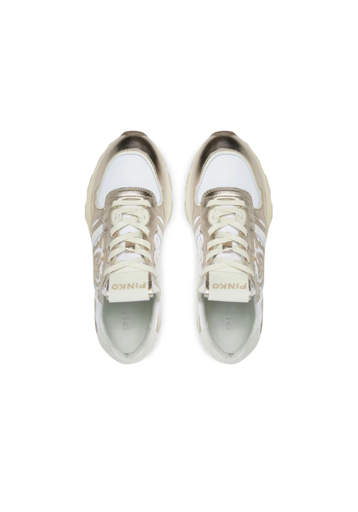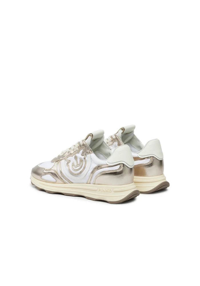 PINKO sneakers with a technical fabric characterized by silver metal leather inserts, with the Love Birds logo that individualizes the outer side of the footprint.