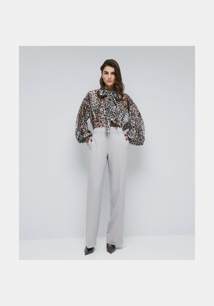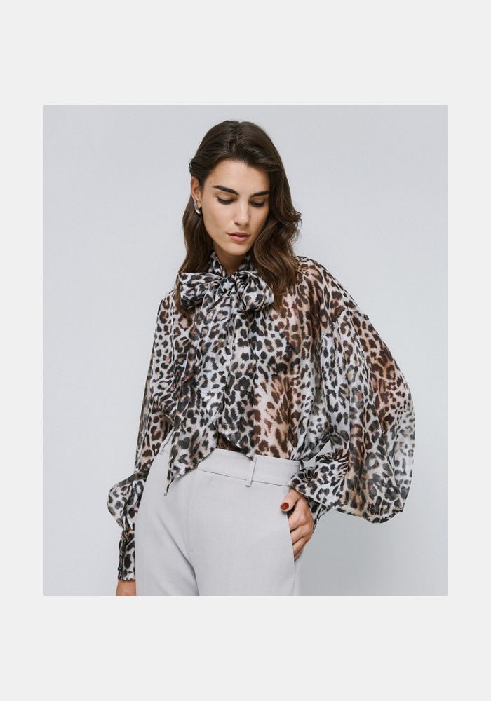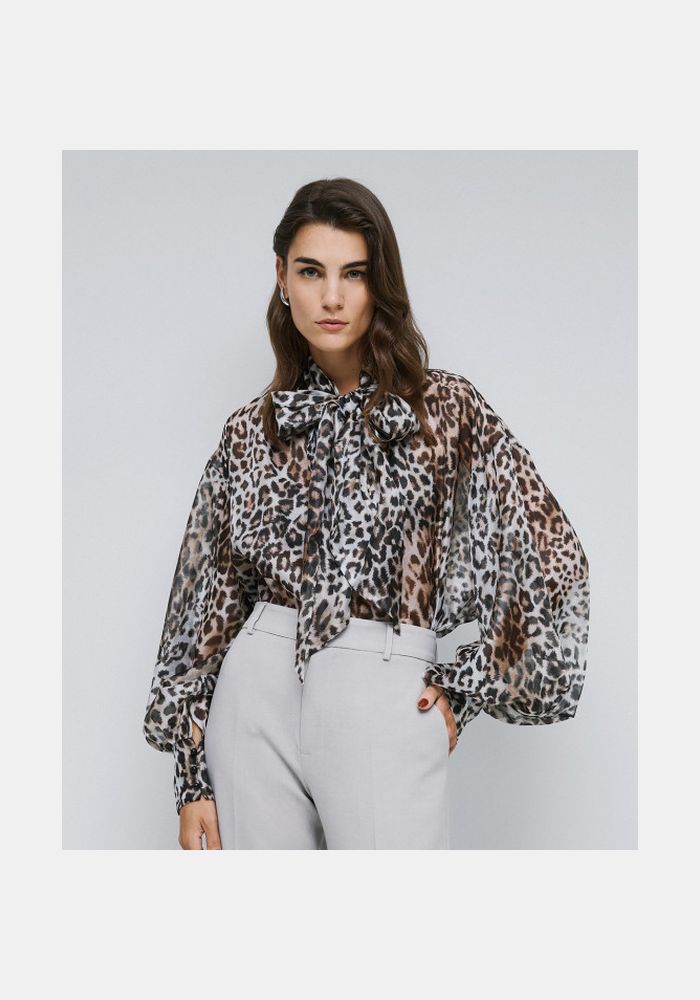 Λεοπάρ ημιδιαφανής μπλούζα με μακριά φουσκωτά μανίκια. Διαθέτει V άνοιγμα μπροστά με δετό λαιμό. Ιδανική επιλογή για κομψές και στιλάτες εμφανίσεις.