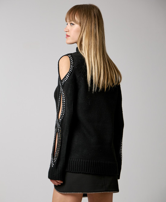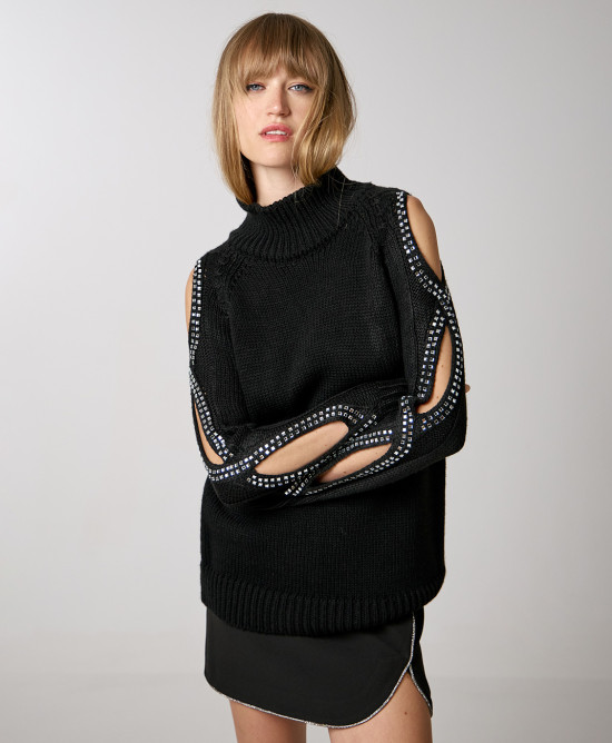 Oversized πλεκτή μπλούζα ζιβάγκο με ανοίγματα, διακοσμημένα με στρας, στα μανίκια. Μία ιδιαίτερη επιλογή που αναβαθμίζει κάθε χειμερινή γκαρνταρόμπα.