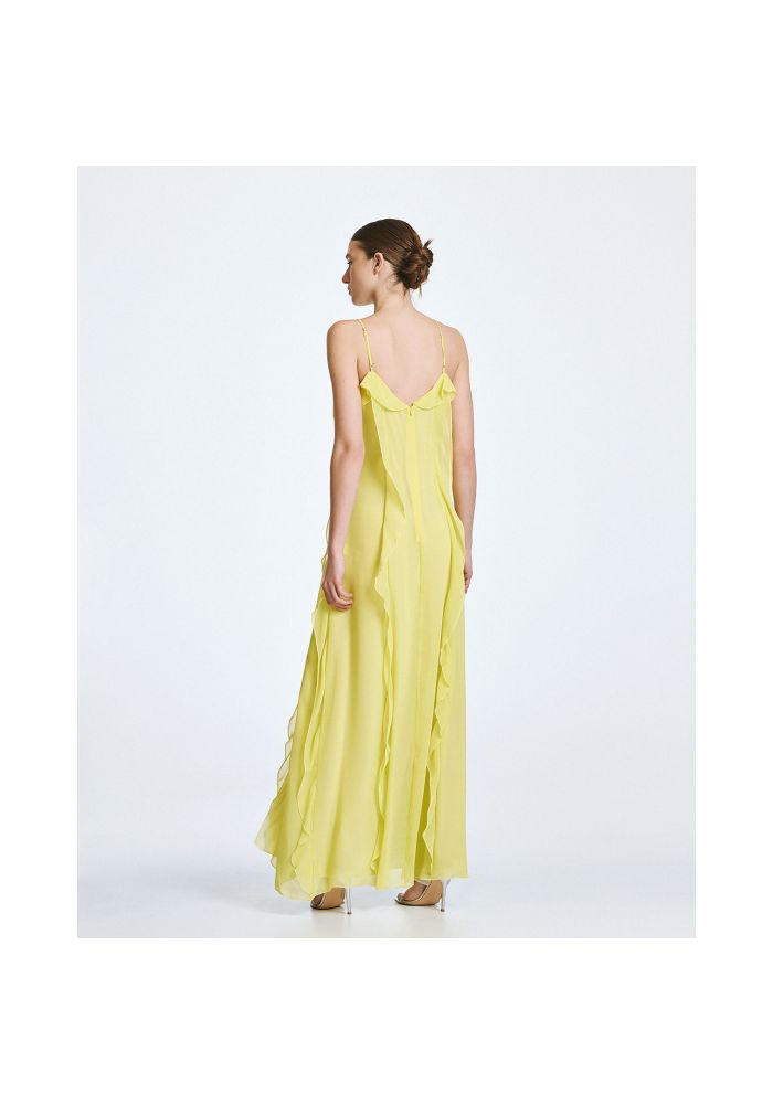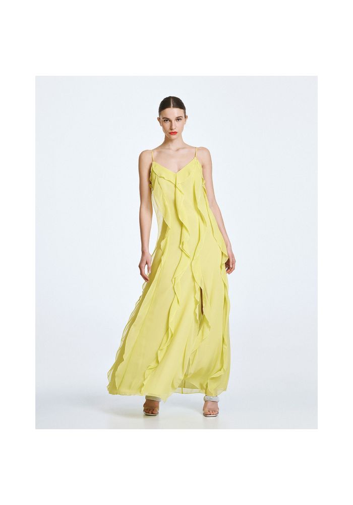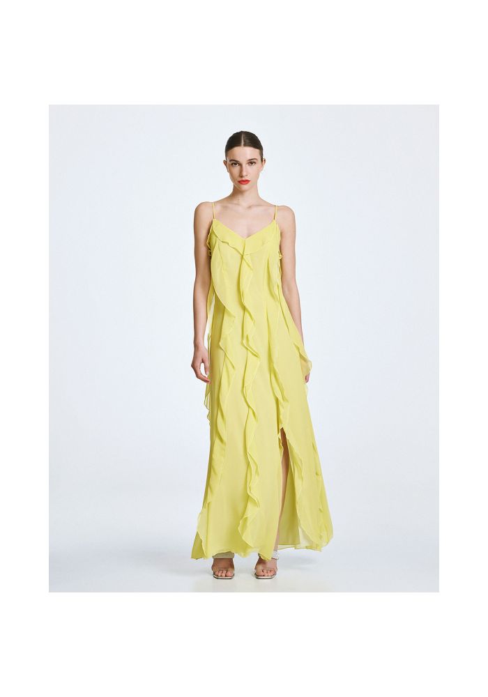 Μάξι φόρεμα με λεπτές ρυθμιζόμενες τιράντες, V λαιμόκοψη και εντυπωσιακά βολάν. Διαθέτει σκίσιμο μπροστά, κλείσιμο με φερμουάρ πίσω και ενσωματωμένη φόδρα.