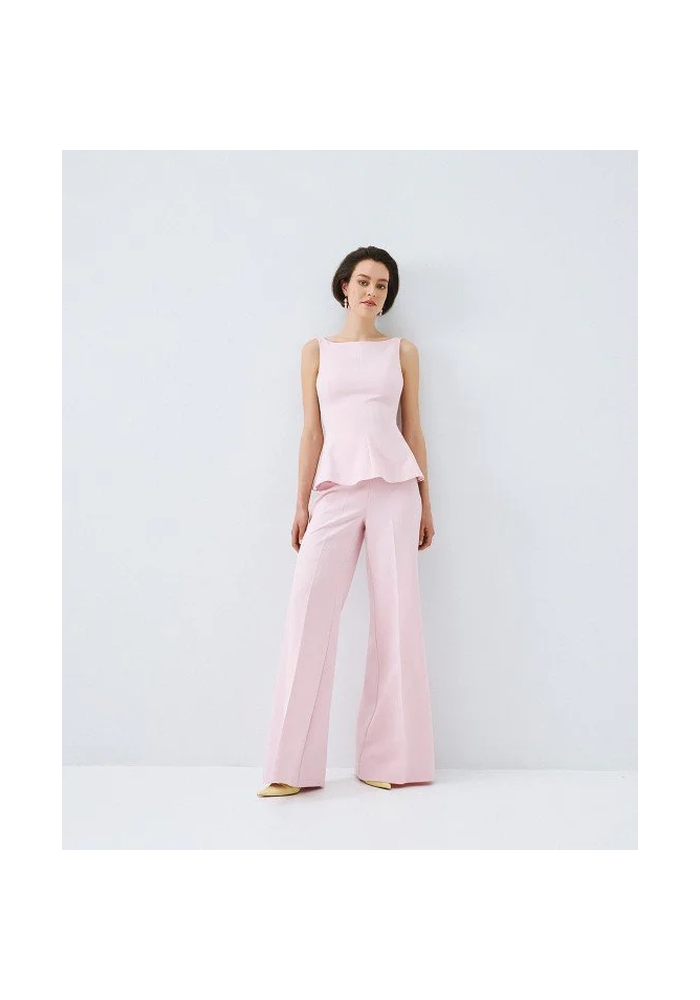 Αμάνικο peplum τοπ με τιράντες και χαμόγελο λαιμόκοψη. Διαθέτει ανοιχτή πλάτη με δέσιμο πίσω και κλείσιμο με φερμουάρ στο πλάι.