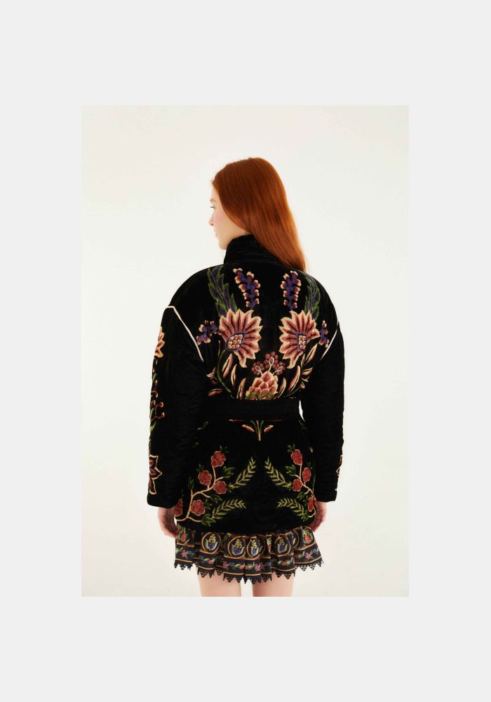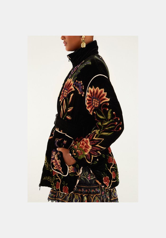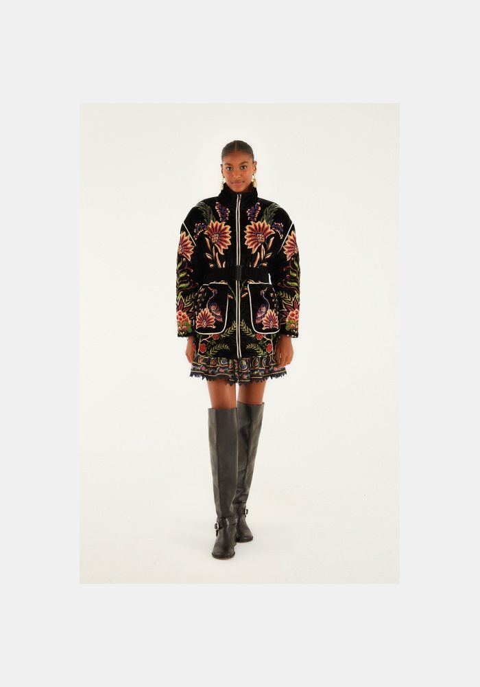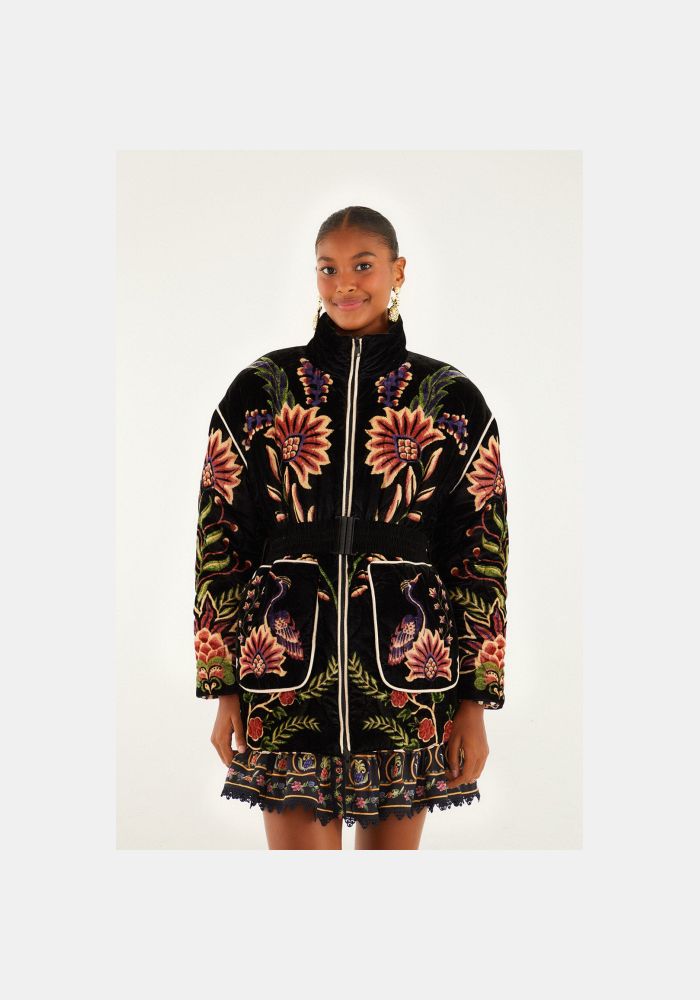 Το μαύρο φουσκωτό μπουφάν Marvelous Garden Puffer Jacket αγκαλιάζει την ψηλή λαιμόκοψη που πλαισιώνει απαλά το πρόσωπο, προσφέροντας ζεστή ατμόσφαιρα. Το καπιτονέ βελούδινο ύφασμά του αναδεικνύει περίπλοκα κεντημένα λουλουδάτα μοτίβα και μοτίβα παγωνιού σε γήινους τόνους, προσδίδοντας μια πλούσια γοητεία εμπνευσμένη από τον κήπο στο κομμάτι. Η σφιχτή μέση με ζώνη προσθέτει μια κολακευτική σιλουέτα, ενώ οι oversized μπροστινές τσέπες και οι παιχνιδιάρικες λεπτομέρειες με ριγέ κορδόνια ενισχύουν το ιδιότροπο και καλλιτεχνικό του πνεύμα, καθιστώντας το ένα εντυπωσιακό πανωφόρι.