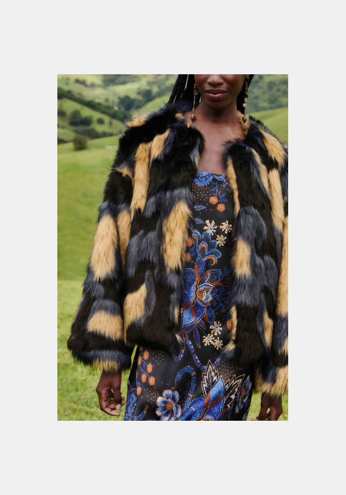 Αγκαλιάστε την ζεστή κομψότητα με το πολύχρωμο γούνινο παλτό από την FARM Rio. Αυτό το θαύμα εξωτερικού χώρου λάμπει με ένα στροβιλιζόμενο patchwork ζεστών μπεζ, βαθύ μαύρου και καπνιστού μπλε αποχρώσεων, συνδυάζοντας την παιχνιδιάρικη γοητεία με την έντονη εμφάνιση. Το ψηλό ντεκολτέ του πλαισιώνει τη σιλουέτα με μια εκλεπτυσμένη αλλά και φιλόξενη πινελιά, ενώ τα ογκώδη μανίκια προσθέτουν μια αίσθηση χαλαρής κομψότητας. Αυτό το παλτό είναι σχεδιασμένο για όσους αγαπούν την απαλότητα τυλιγμένη σε ζωντανή έκφραση.
