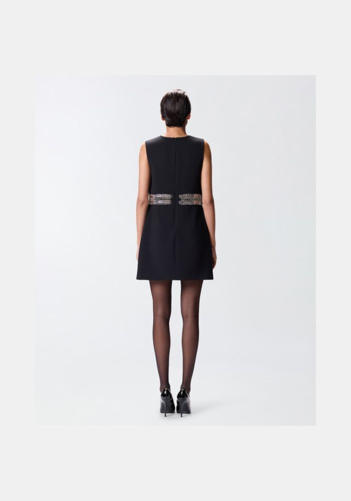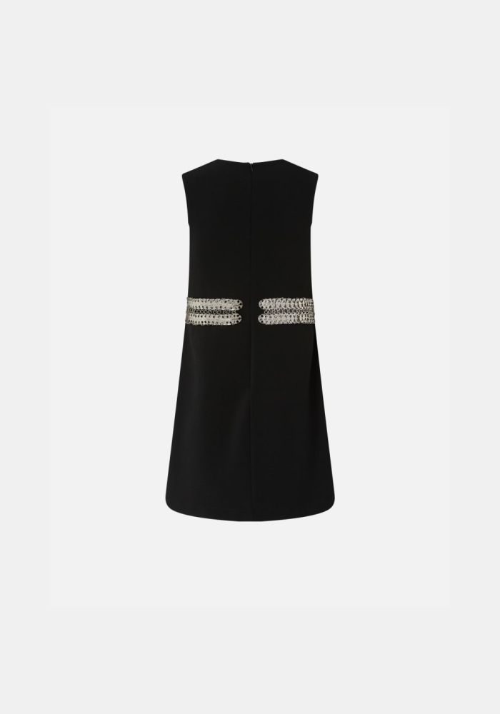 Κομψό αμάνικο φόρεμα σε απαλό μαύρο κρεπ, που χαρακτηρίζεται από μια εκλεπτυσμένη διακοσμητική λωρίδα που περιβάλλει τη μέση. Το μινιμαλιστικό σχέδιο είναι εμπλουτισμένο με πολύτιμες λεπτομέρειες που τραβούν το φως, ενώ η ίσια σιλουέτα και το μίντι μήκος δημιουργούν μια καθαρή και εκλεπτυσμένη γραμμή. Το αόρατο κλείσιμο με φερμουάρ στην πλάτη εξασφαλίζει άψογη εφαρμογή, καθιστώντας αυτό το φόρεμα ιδανικό για ειδικές περιστάσεις όπου η κομψότητα κάνει τη διαφορά. Συνδυάστε το με nude γόβες και ένα μεταλλικό τσαντάκι για μια εμφάνιση κοκτέιλ πάρτι ή φορέστε το με σανδάλια με κοσμήματα για τις πιο λαμπερές σας βραδιές.