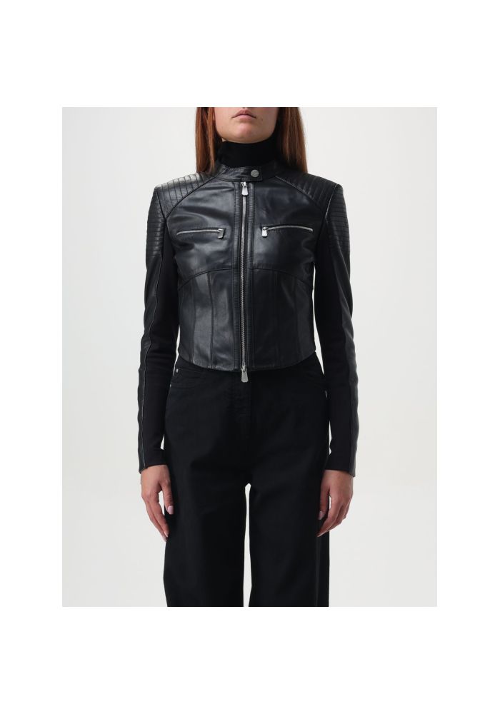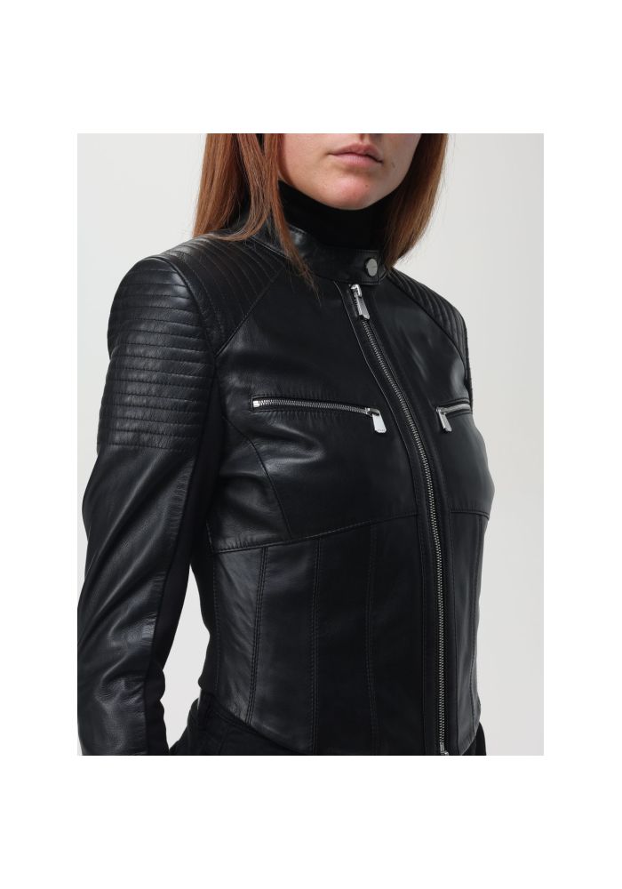 Δερμάτινο μπουφάν κομμένο σε στυλ biker με τεχνικά ελαστικά ένθετα από ύφασμα βισκόζης στην πλάτη και στο κάτω μέρος των μανικιών. Μικρό όρθιο γιακά με κουμπιά, μπούστο σε στυλ μπουστού, μικρές τσέπες και μανσέτες με μεταλλικό φερμουάρ. Κλείσιμο με φερμουάρ στο μπροστινό μέρος.