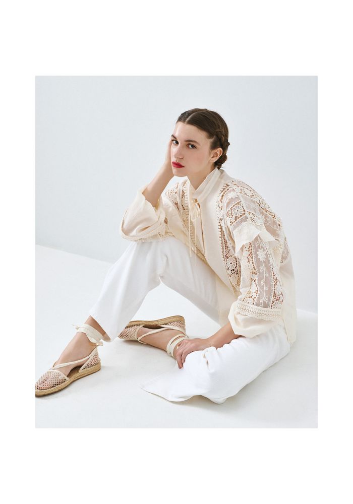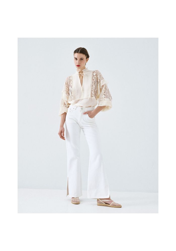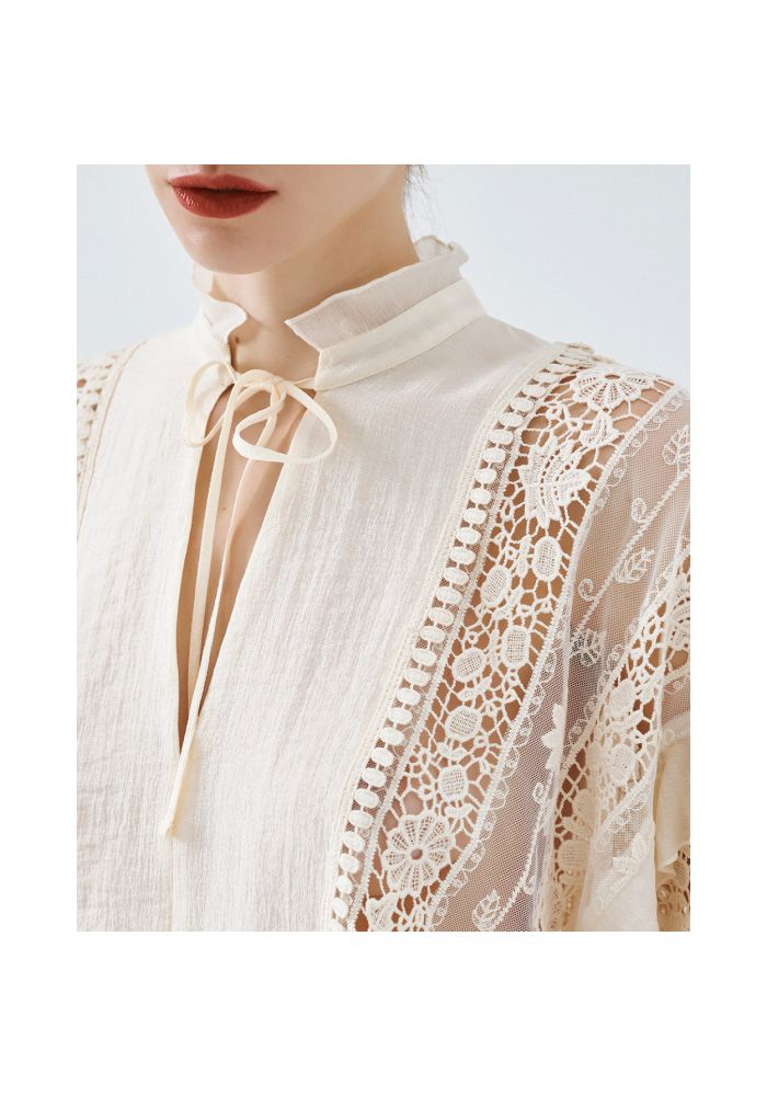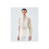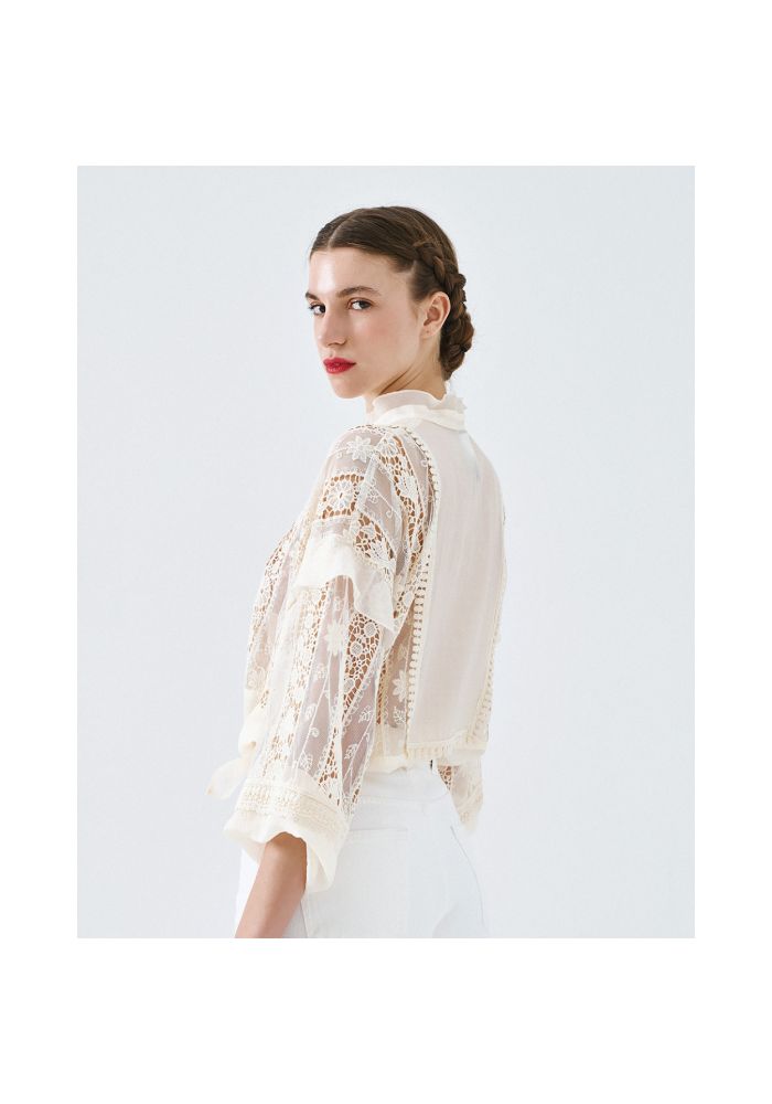 Μπλούζα με V λαιμόκοψη, ψηλό λαιμό με δετά κορδόνια και μακριά φουσκωτά μανίκια με ελαστικές μανσέτες. Διαθέτει κροσέ δαντελένιες λεπτομέρειες, μικρά πλαϊνά ανοίγματα και βολάν.