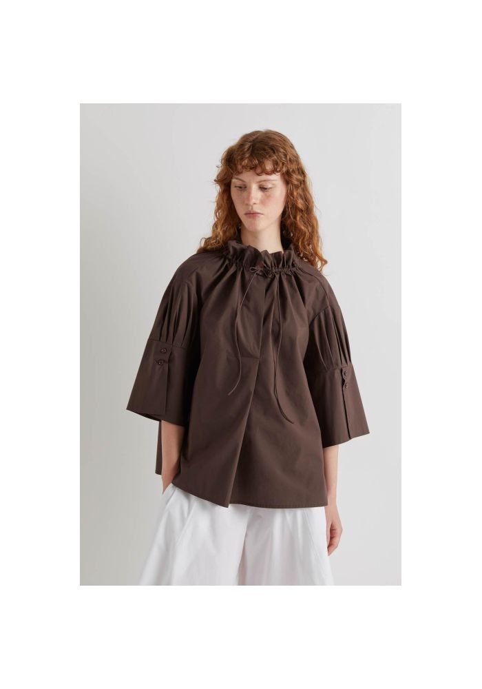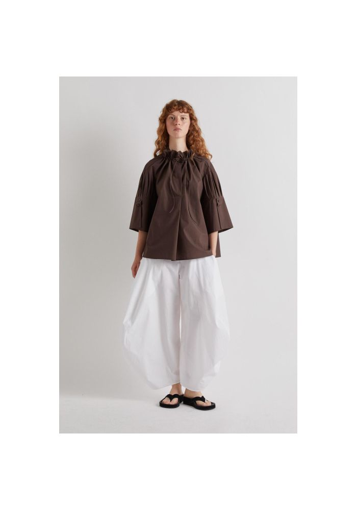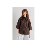 Μπλούζα με βολάν στον γιακά και κορδέλα για κόμπο. Λεπτομέρεια με κοντό φαρδύ μανίκι με μανσέτες. Χαλαρή εφαρμογή.