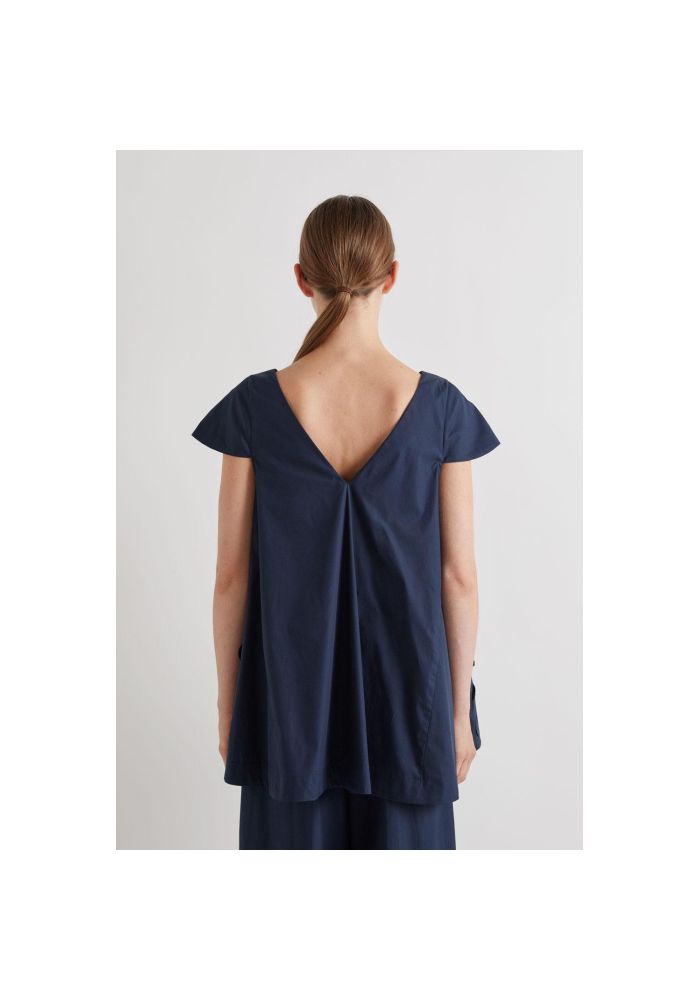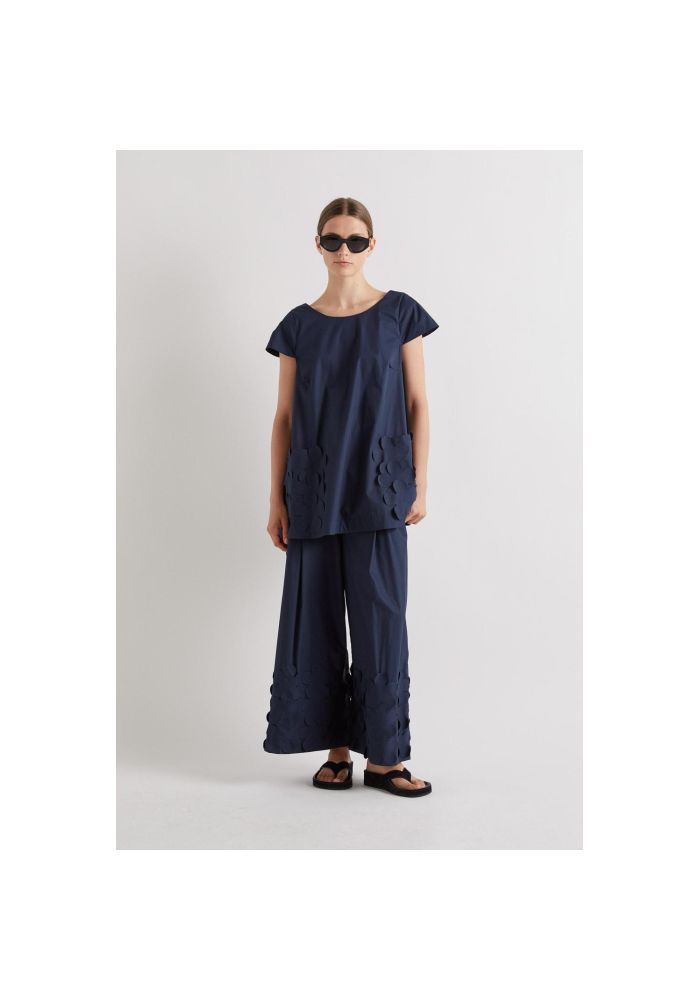 Μπλούζα σε Α γραμμή, με απλικέ λουλούδια στις τσέπες. Με καπάκι στα μανίκια και V στο πίσω μέρος.