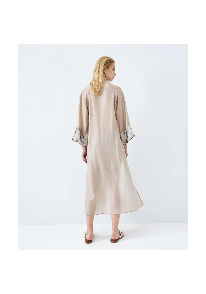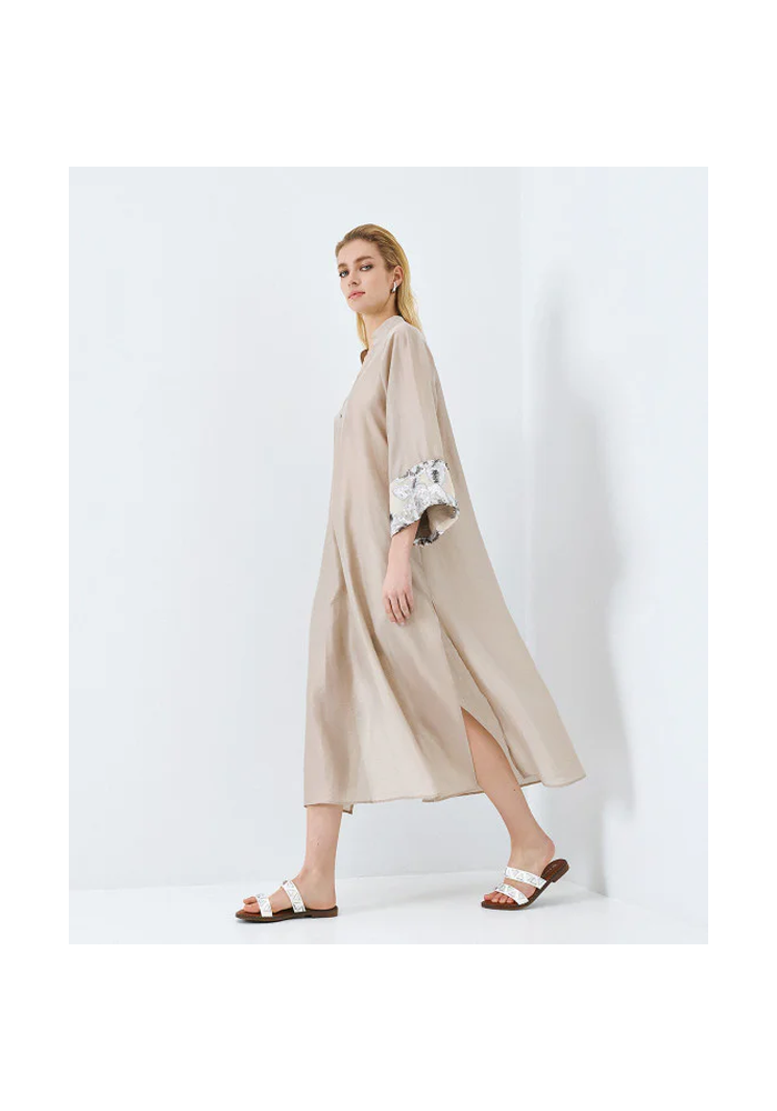 Ημιδιαφανές μακρύ φόρεμα με τσαλακωτή όψη, μάο γιακά και V λαιμόκοψη. Διαθέτει μακριά φαρδιά μανίκια με κεντημένες παγιέτες στις μανσέτες, κλείσιμο με κουμπάκια μπροστά και αποσπώμενη μίνι φούστα-μεσοφόρι.