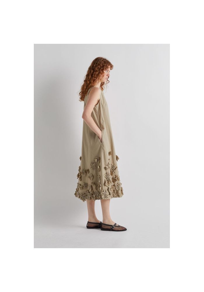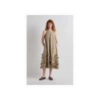 Μακρύ φόρεμα σε Α γραμμή με απλικέ λουλούδια στο τελείωμα, στρογγυλή λαιμόκοψη, τσέπες στα πλαϊνά και κλείσιμο με κουμπί στο πίσω μέρος.