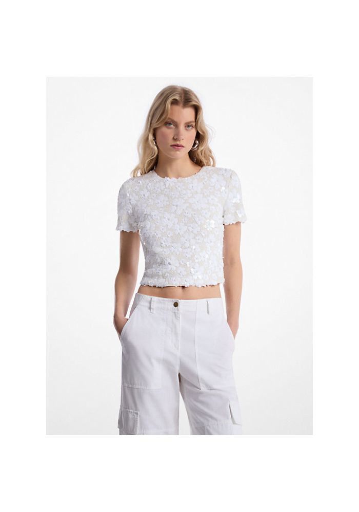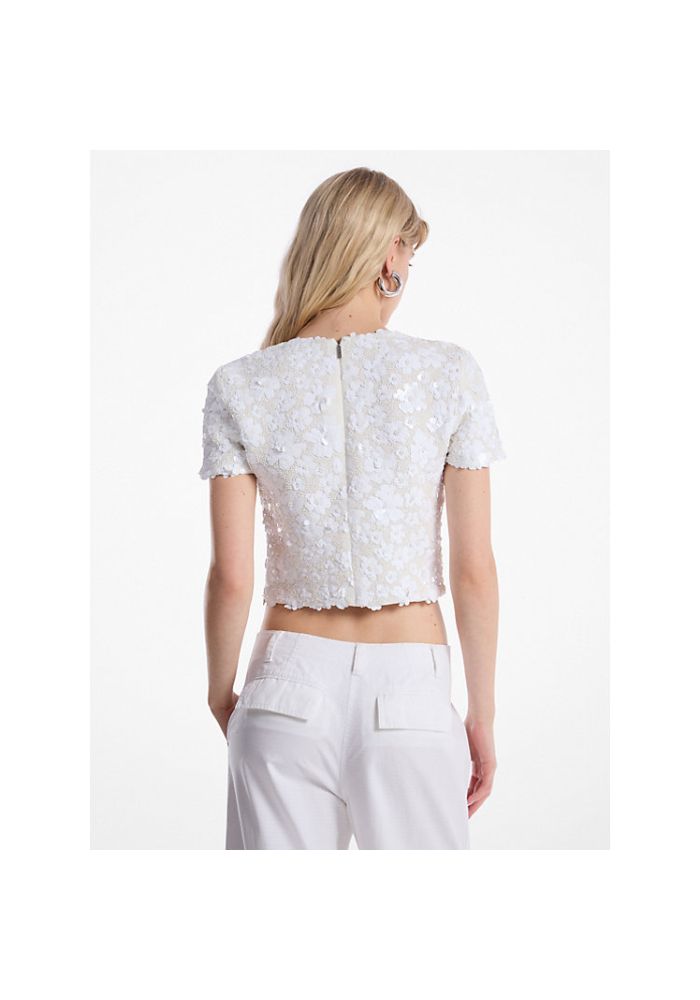 Παιχνιδιάρικο και κομψό ταυτόχρονα, αυτό το τοπ δεν είναι για wallflower. Είναι σχεδιασμένο σε σχήμα εμπνευσμένο από μπλουζάκι και διαθέτει στολίδια με χάντρες και πούλιες που δημιουργούν ένα τρισδιάστατο λουλουδάτο μοτίβο. Μετριάστε την cropped εφαρμογή με ψηλόμεσο παντελόνι.96% πολυεστέρας/4% ελαστάνη • Κλείσιμο με φερμουάρ