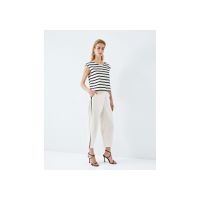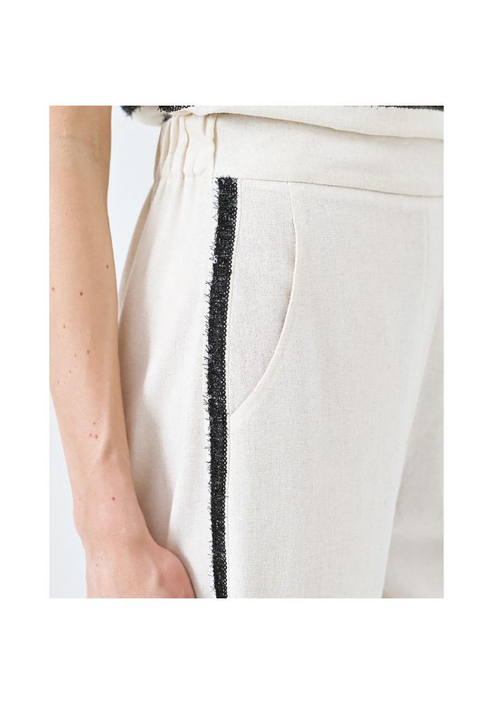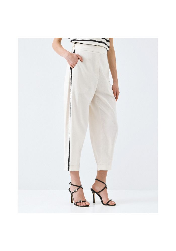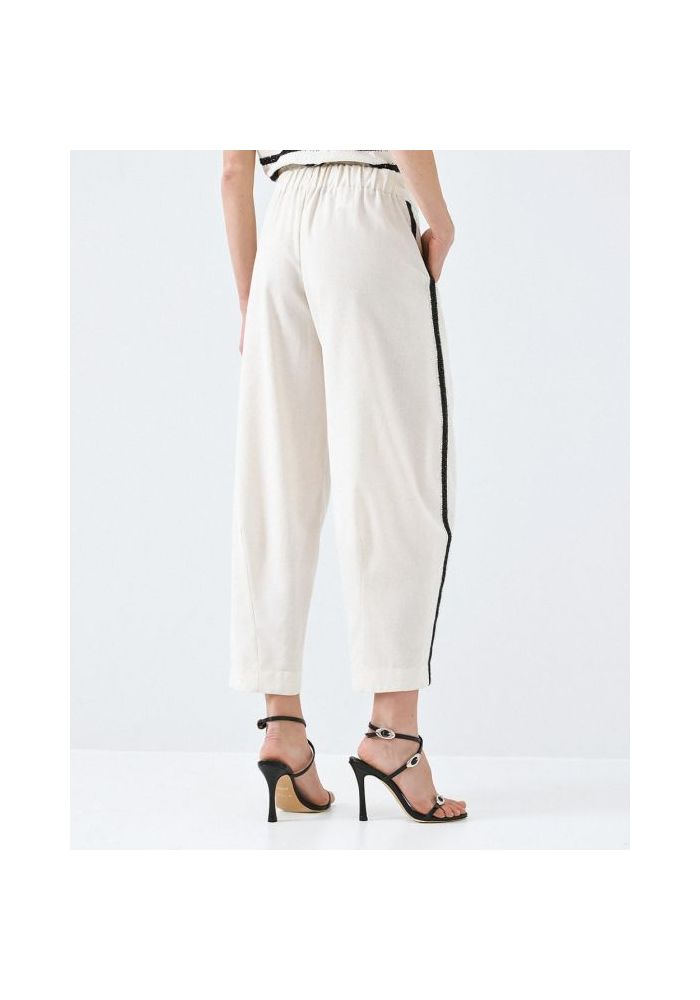 Κομψό παντελόνι σε χαλαρή γραμμή, Διαθέτει φαρδιά μπατζάκια που στενέυουν ελαφρώς στο τελείωμα, λεπτές πλαινές φάσες με γυαλιστερή μαύρη κλωστή και μικρές μαύρες πούλιες, δύο πλαινές τσέπες, λάστιχο στο πίσω μέρος της μέσης και κλείσιμο με φερμουάρ στο πλάι. Ιδανικό για κάθε ώρα της ημέρας.