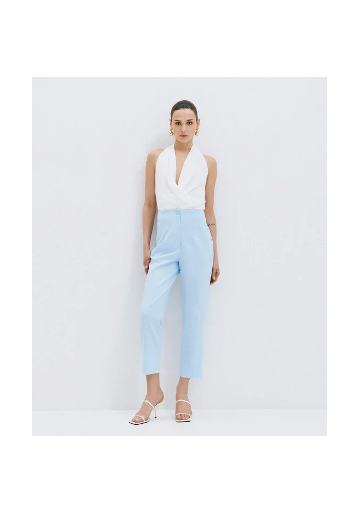 Κομψό παντελόνι σε γαλάζια απόχρωση που συνδυάζει minimal αισθητική με μοντέρνα γραμμή.