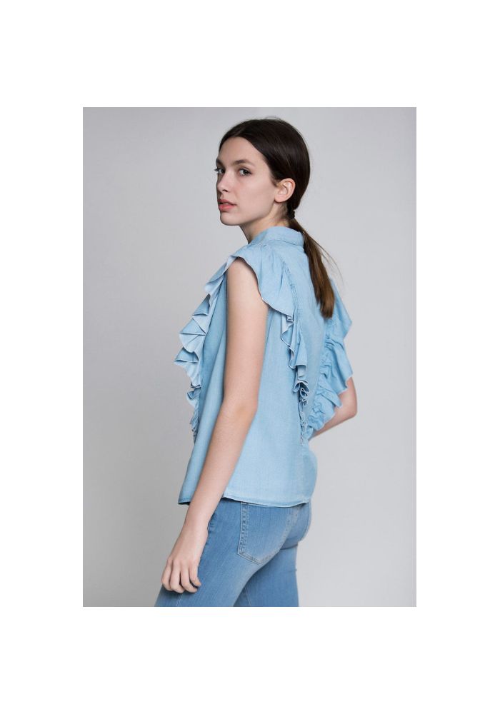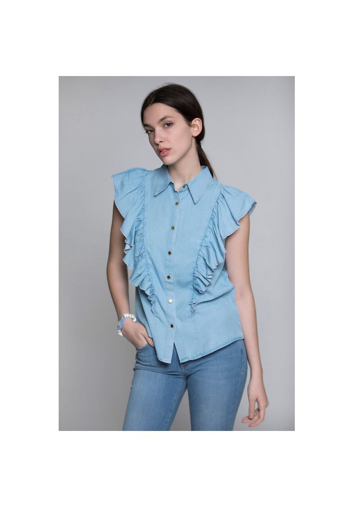 PINKO Πουκάμισο αμάνικο denim. Διαθέτει γιακά, βολάν στα μανίκια και κατά μήκος μπροστά και στο πίσω μέρος και κούμπωμα με μεταλλικά μικρά κουμπιά. Σύνθεση: 100% Lyocell