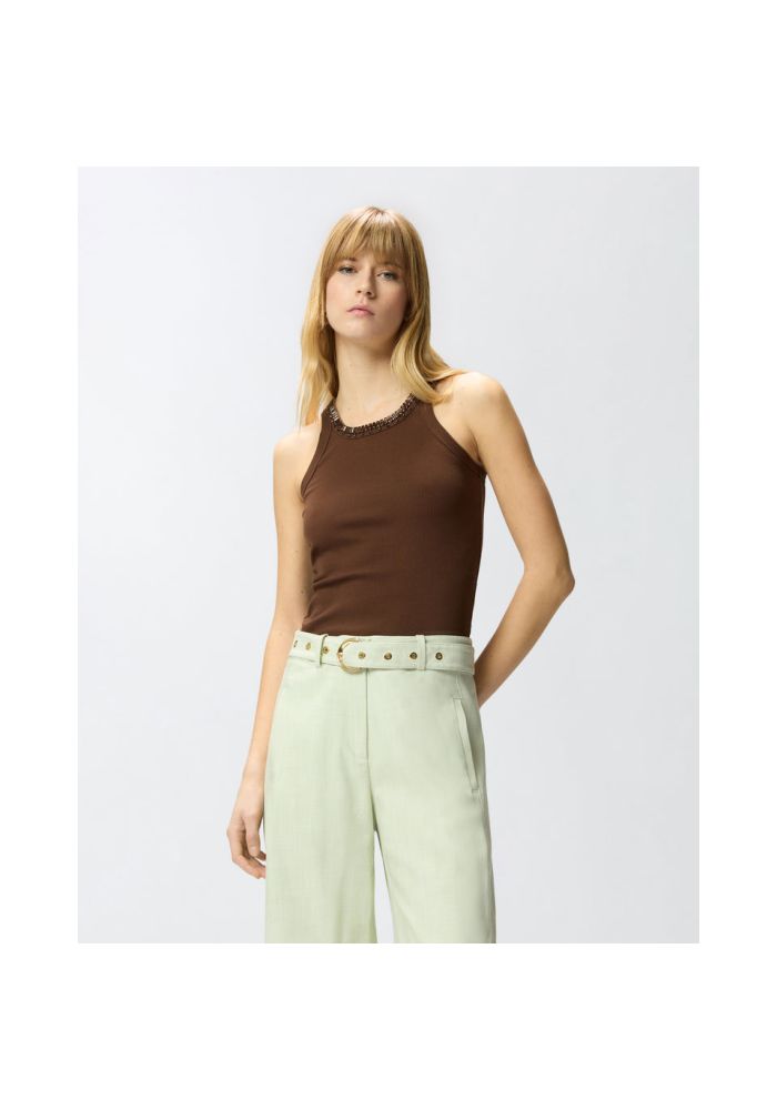 Τοπ με λαιμόκοψη halter από ελαστικό βαμβακερό ριμπ ύφασμα. Το περίγραμμα της λαιμόκοψης μπροστά είναι διακοσμημένο με λαμπερά στρας και κρύσταλλα περίτεχνα κεντημένα στο χέρι, χαρίζοντας λάμψη και πολυτελές στυλ στο ρούχο. Αναβαθμίστε την κομψότητα και τη θηλυκότητα κάθε συνόλου με αυτό το τοπ, που είναι τέλειο κάτω από ένα σακάκι σε συνδυασμό με ένα κλασικό παντελόνι, αλλά και με ένα ιδιαίτερο τζιν.