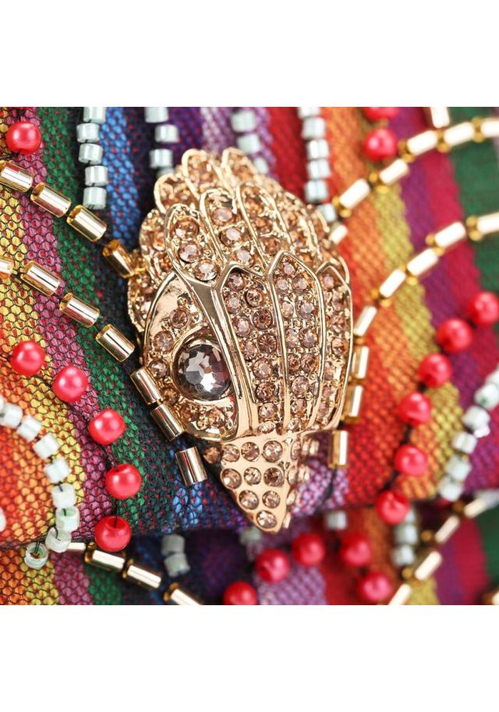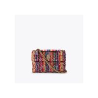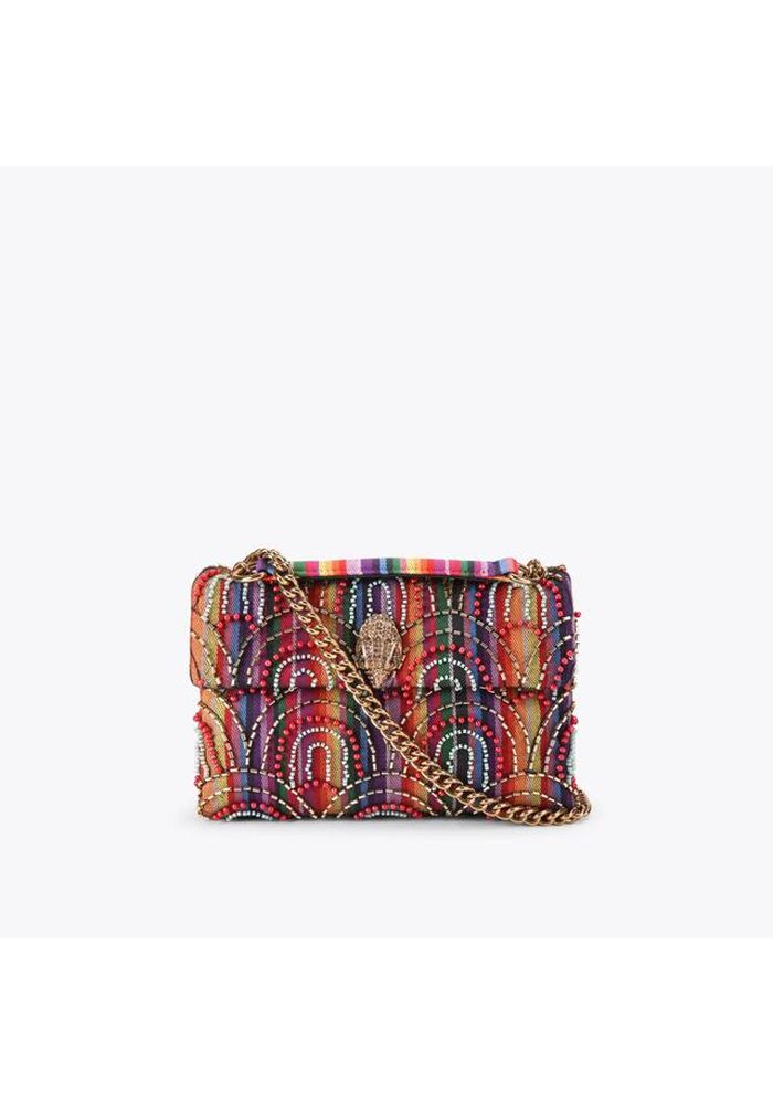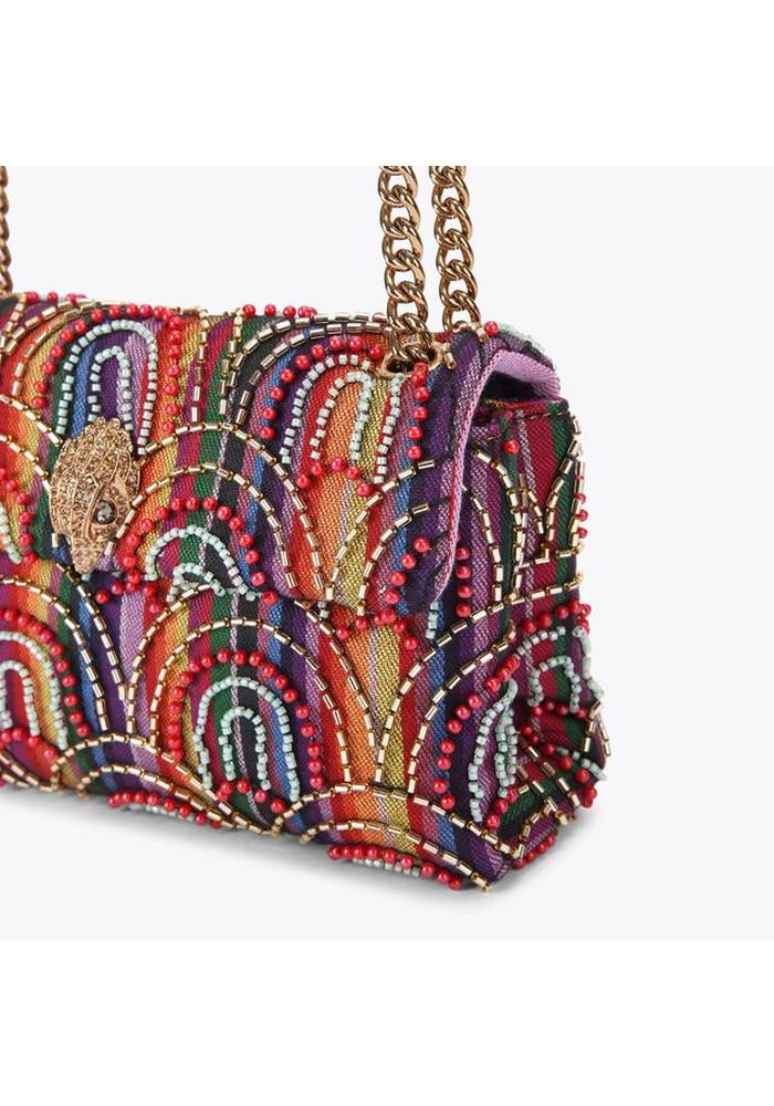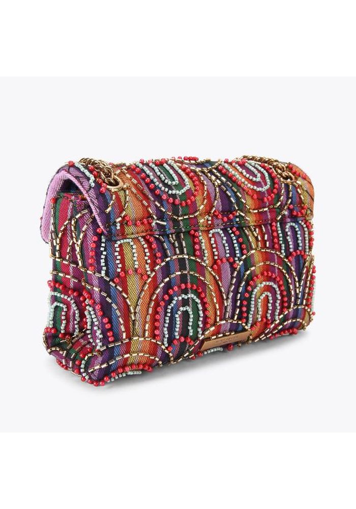 Η τσάντα Kensington Medium Soft είναι κατασκευασμένη από ριγέ ύφασμα, διακοσμημένο με χάντρες που δημιουργούν ένα απλό σχέδιο ουράνιου τόξου. Η χρυσή μεταλλική κεφαλή αετού βρίσκεται στο μπροστινό πτερύγιο της τσάντας. Διαθέτει χρυσό μεταλλικό λουράκι με αλυσίδα, κλείσιμο με διπλό μαγνητικό κούμπωμα κρυμμένο κάτω από το πτερύγιο, χρυσή ετικέτα με λογότυπο στο πίσω μέρος, χωράει τηλέφωνα έως 7 ίντσες, μικρή εσωτερική τσέπη με επένδυση και εσωτερική επένδυση με μονόγραμμα. 14 εκ. (Υ), 20 εκ. (Μ), 6 εκ. (Β)