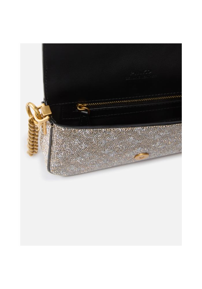 Εκλεπτυσμένη, φαρδιά τσάντα μωρού, πλήρως καλυμμένη με στρας που δημιουργούν το εμβληματικό μοτίβο μονόγραμμα με ένα λαμπερό και λαμπερό αποτέλεσμα. Η τρουκ επιφάνεια παγιδεύει το φως, δίνοντας φωτεινότητα και πολύτιμο χαρακτήρα στο αξεσουάρ, ενώ η συμπαγής δομή με μπροστινό καπάκι και μαγνητικό κλείσιμο εγγυάται πρακτικότητα για καθημερινή χρήση. Το μεταλλικό λογότυπο κοσμεί το μπροστινό κλείσιμο, ολοκληρώνοντας τον πολυτελή σχεδιασμό, σε συνδυασμό με μεταλλική αλυσίδα και δερμάτινο λουράκι ώμου για ευελιξία στη χρήση. Οι εφαρμοσμένοι κρύσταλλοι σχηματίζουν ένα μοτίβο σε όλη την επιφάνεια που προσδίδει φινέτσα και διακριτικότητα, μετατρέποντας το αξεσουάρ σε ένα πραγματικό κομμάτι με έντονη οπτική επίδραση. Ιδανική για να φωτίσει τις βραδινές εμφανίσεις ή να προσθέσει λάμψη σε casual εμφανίσεις, συνδυάζεται όμορφα με μονόχρωμα ρούχα για να ενισχύσει το λαμπερό αποτέλεσμα. Σύνθεση: Εξωτερικό ύφασμα: ΔΙΟΞΕΙΔΙΟ ΠΥΡΙΤΙΟΥ 100% - Εσωτερικό: ΔΕΡΜΑ ΑΓΕΛΑΔΑΣ 100% - Αξεσουάρ: Ψευδάργυρος 100% Μετρήσεις: Ύψος: 11 cm Πλάτος: 4 cm Μήκος: 18 cm