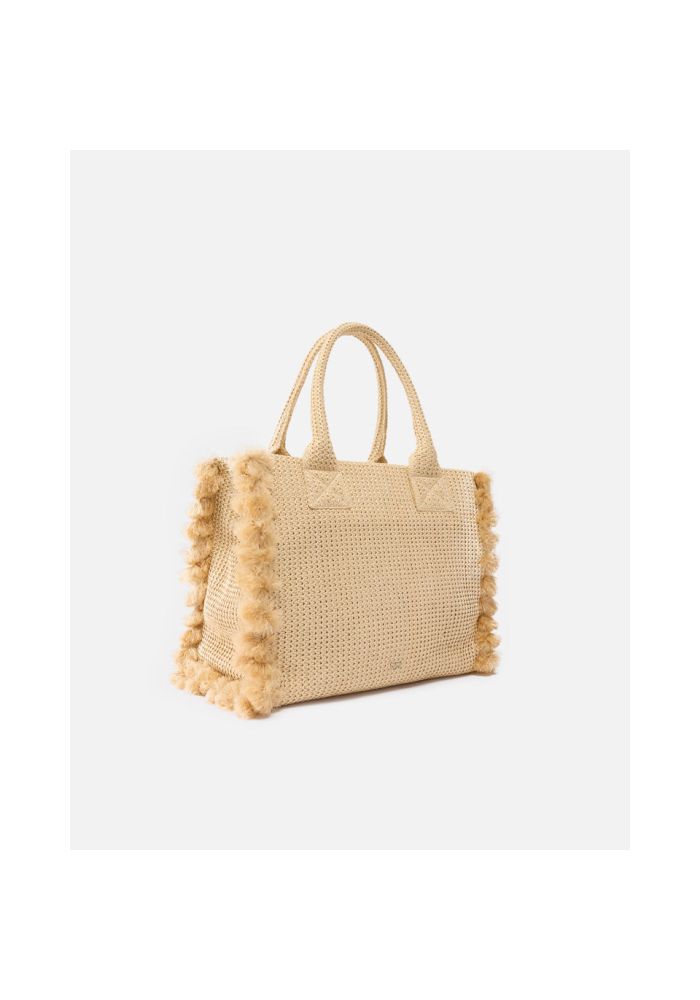 Μεσαίου μεγέθους, ελαφρώς επιμήκης ορθογώνια τσάντα θαλάσσης για ψώνια, κατασκευασμένη από υφαντό ράφια, με εξατομικευμένη σχεδίαση και το λογότυπο PINKO σε αντίθεση, κεντημένο στο μπροστινό μέρος. Ιδανική ως τσάντα θαλάσσης, αυτή η τσάντα διαθέτει λαβή στο πάνω μέρος για μεταφορά στο χέρι ή στον ώμο και είναι επιπλέον διακοσμημένη με παιχνιδιάρικες, ασορτί φούντες στα πλάγια. Το κλείσιμο με φερμουάρ αποκαλύπτει ένα εσωτερικό με βαμβακερή επένδυση και μια βολική τσέπη στον τοίχο με ετικέτα με το λογότυπο. Ενεργοποιήστε το αξεσουάρ PINKO: επαληθεύστε την αυθεντικότητα του προϊόντος σας και αποκτήστε πρόσβαση στην εξατομικευμένη εμπειρία κρατώντας το smartphone σας κοντά στο κέντημα Love Birds στο πίσω μέρος!